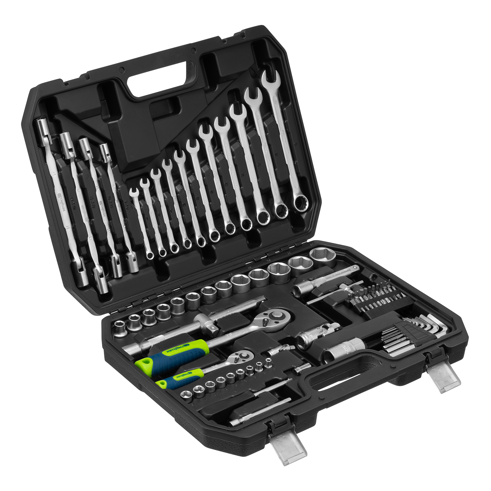 - Комфортная и эффективная работа — ключи-трещотки с 45 зубьями оснащены механизмом быстрого сброса, переключателем реверса с металлическим флажком и двухкомпонентной рукояткой.