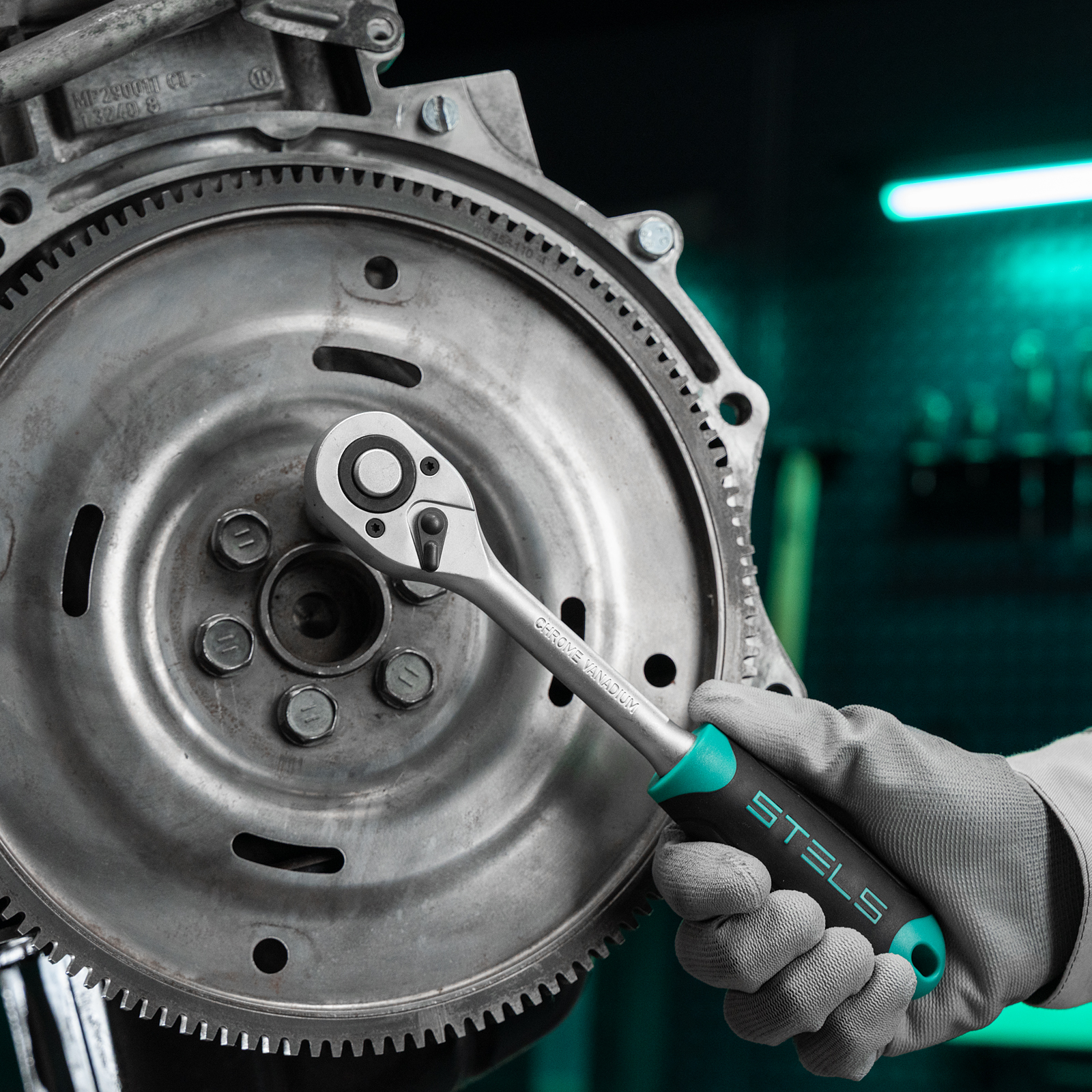 - Защита от разрушения — матовое антикоррозийное покрытие предотвращает появление ржавчины, а рукоятка трещотки из полипропилена и резины устойчива к воздействию бензина и масла.