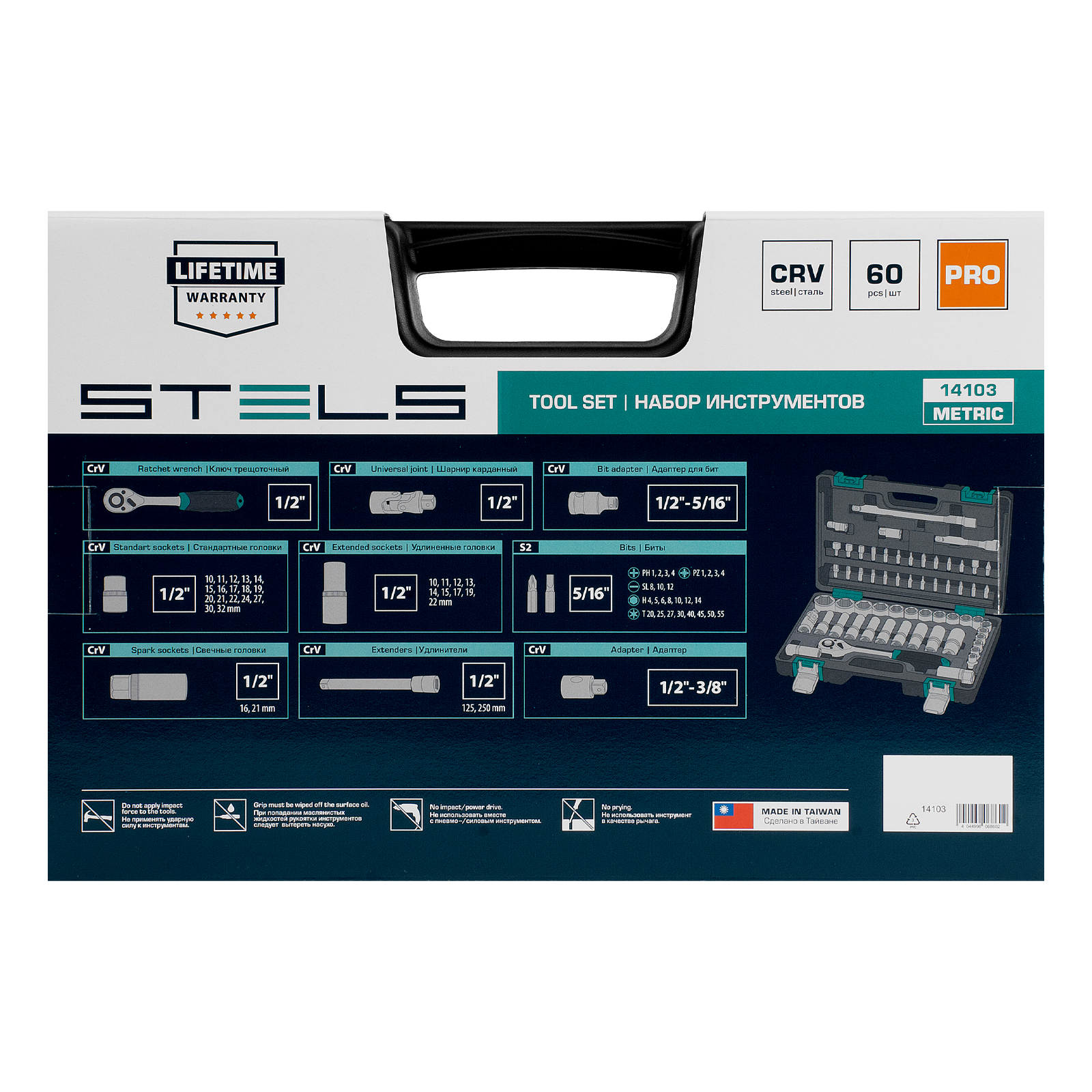 Набор инструментов Stels 14103 в пластиковом кейсе включает в себя 60 предметов с присоединительным размером 1/2 дюйма из стали CrV. Он применяется для монтажа и демонтажа резьбовых соединений во время обслуживания и ремонта авто, а также выполнения бытовых работ. Инструменты пригодятся автолюбителям и домашним мастерам.
