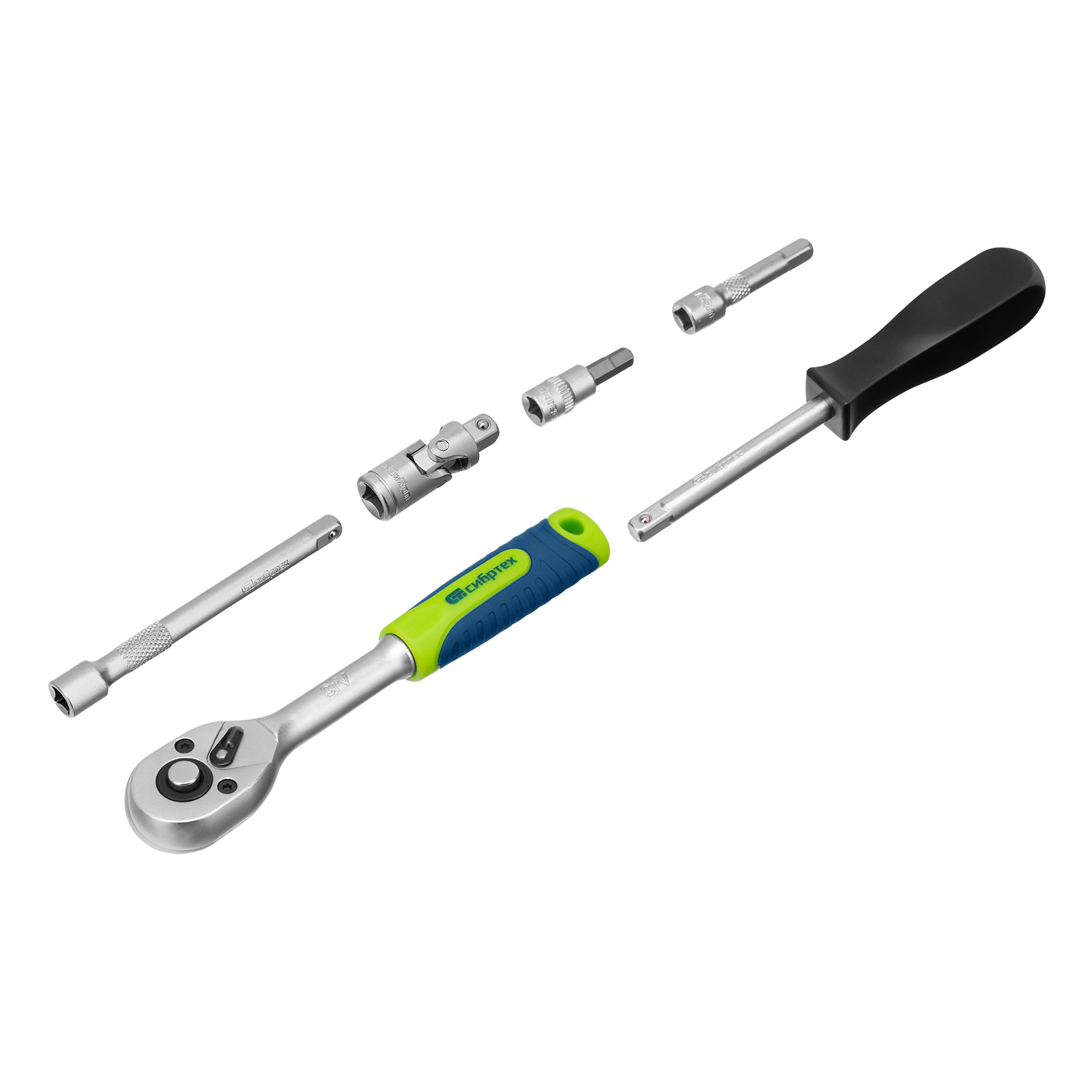 - Прочная фиксация — шариковый замок на трещотках, воротках, шарнирах и удлинителях надежно удерживает головки.