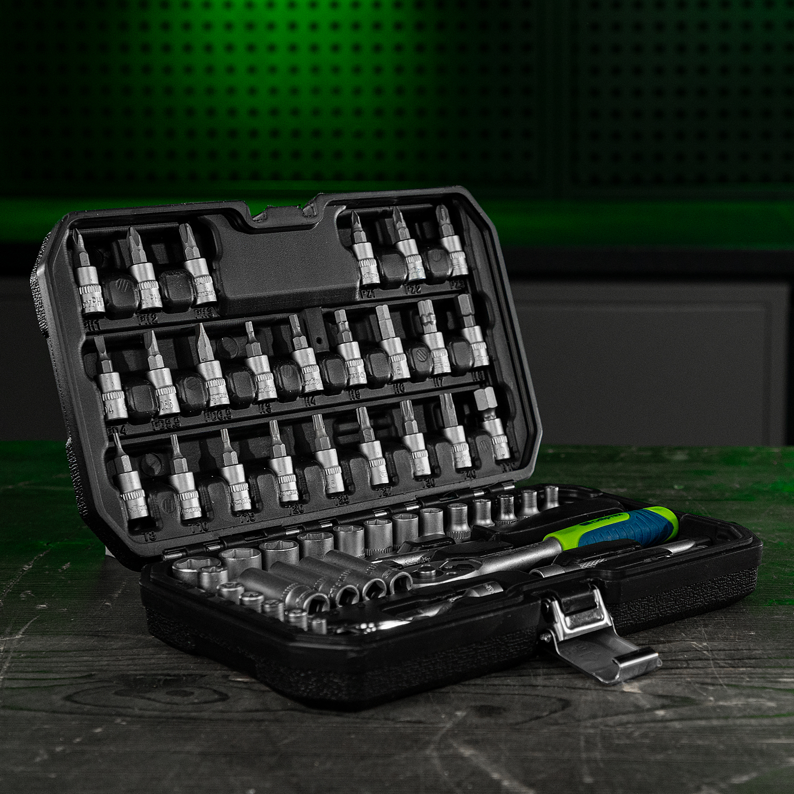 - Удобное хранение и транспортировка — инструменты и насадки упакованы в ударопрочный пластиковый кейс с металлическими замками.