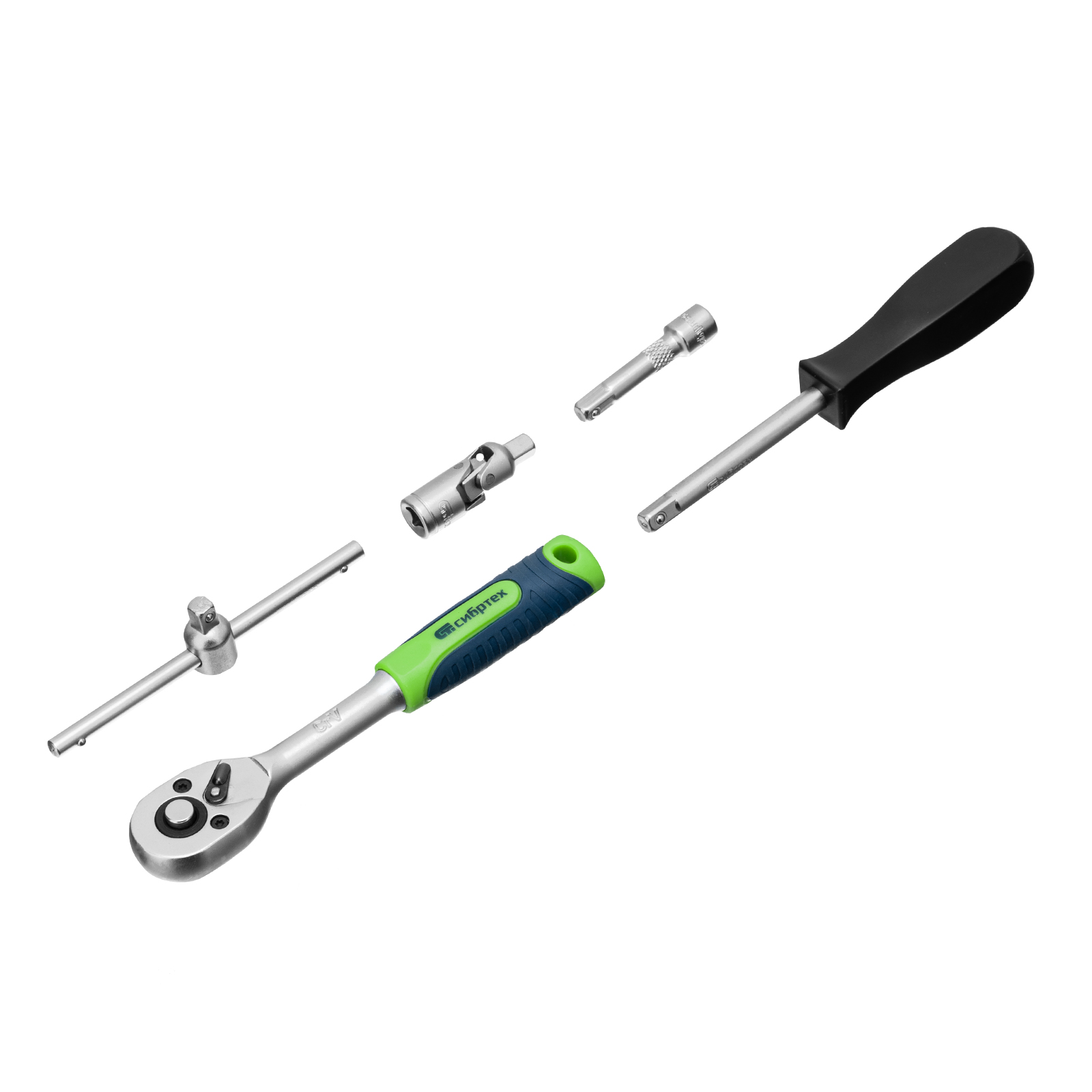 - Прочная фиксация — шариковый замок на трещотках, воротках, шарнирах и удлинителях надежно удерживает головки.