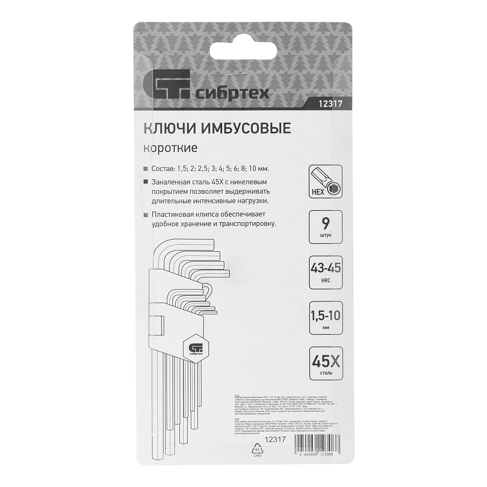 Набор ключей имбусовых HEX, 1.5-10 мм, 45x, закаленные, 9 шт, короткие, никель Сибртех в Воронеже