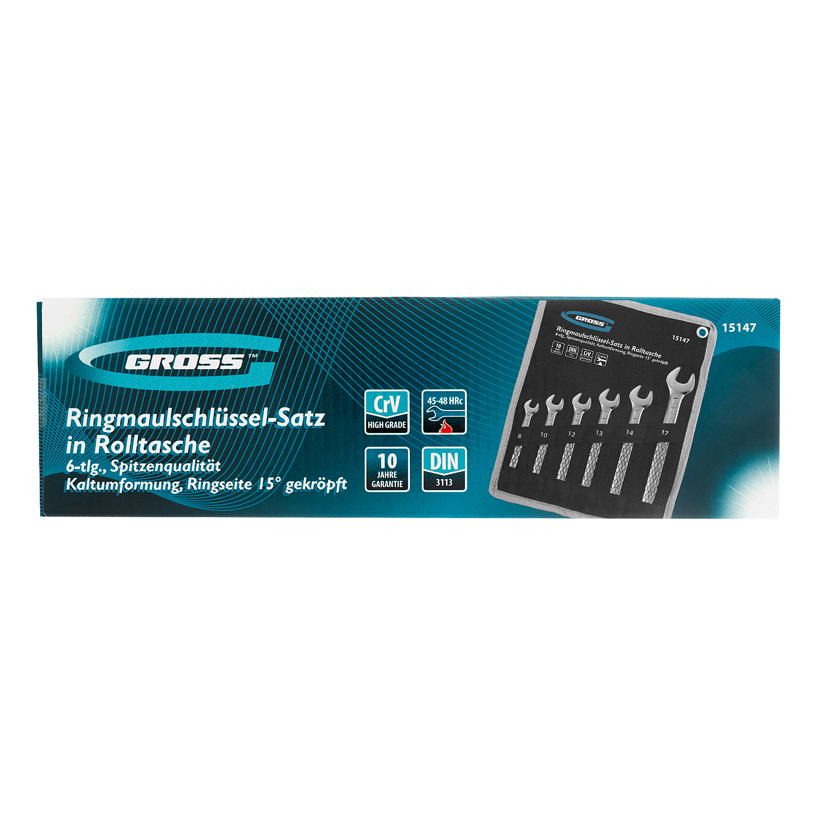 Набор комбинированных ключей Gross 15147 из 6 шт. размером от 8 до 17 мм, холодный штамп, — комплект ручных слесарно-монтажных инструментов из стали CrV, позволяющих закручивать и откручивать гаечные и болтовые соединения. Кольцевой зев каждого ключа имеет 12-гранную рабочую поверхность и крепко удерживает крепеж, не повреждая его. Ключи используются при ремонте автомобилей, сборке техники, будут полезны и в быту.