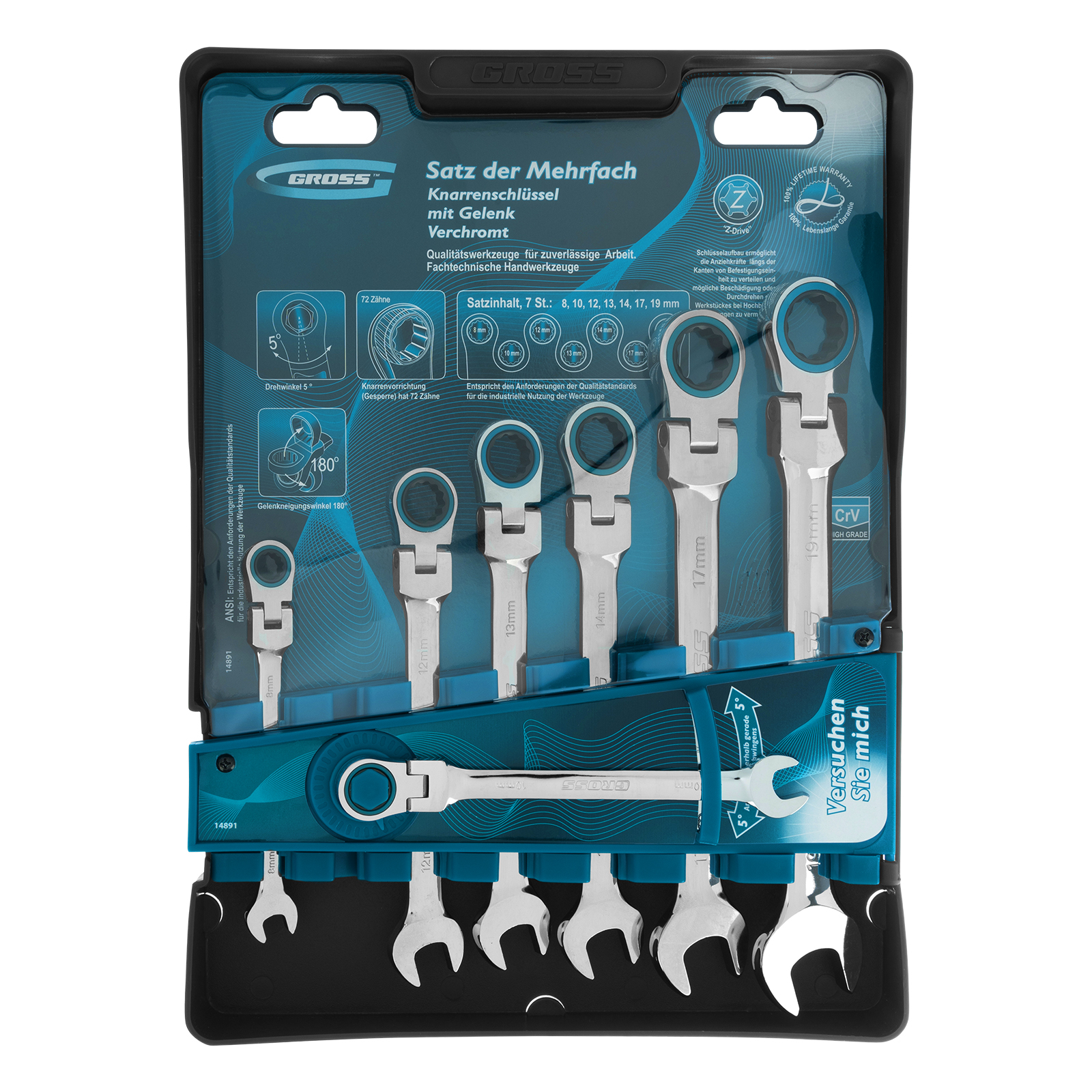 Набор ключей комбинированных с трещоткой, 8-19 мм, 7 шт, шарнирные, CrV Gross в Воронеже
