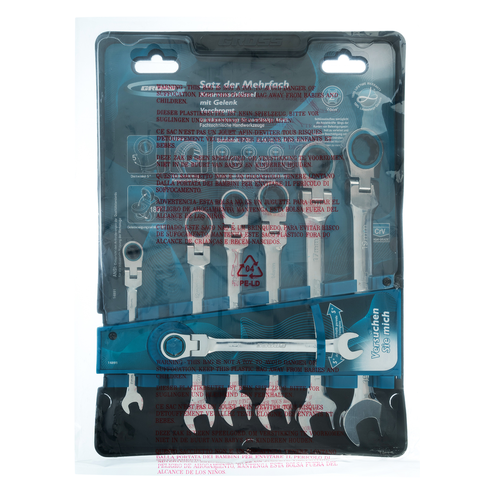 Набор шарнирных комбинированных ключей с трещоткой Gross 14891 включает в себя 7 предметов из стали CrV для откручивания и закручивания резьбовых соединений с диаметром головки 8-19 мм. Благодаря наличию рожкового зева ключи подходят для любых типов крепежей. 12-гранная кольцевая головка обеспечивает надежный контакт с поверхностью болта или гайки, облегчая работу и уменьшая риск деформации граней крепежа. Набор используется для обслуживания и ремонта автомобилей, пригодится также и в быту.