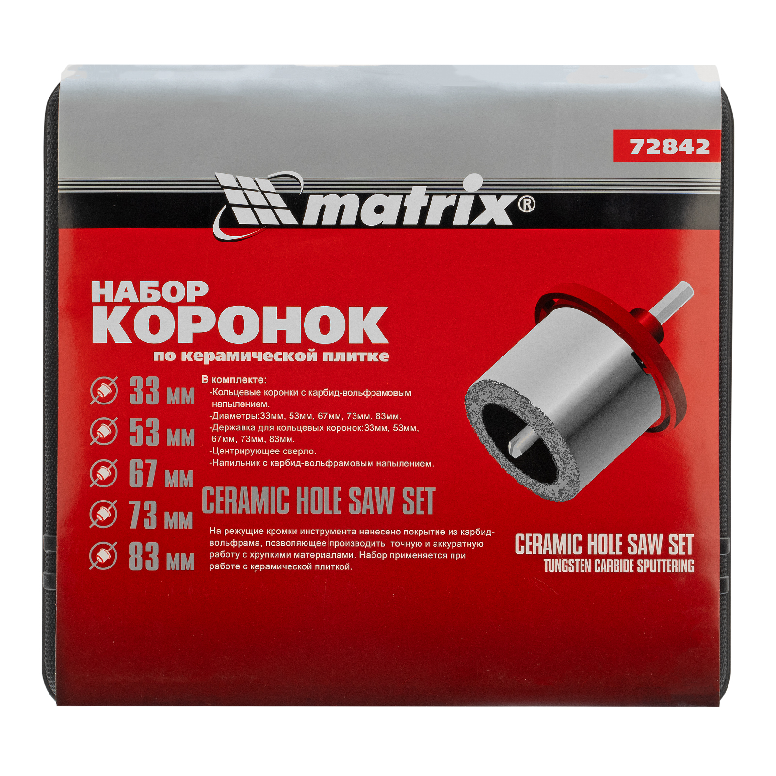 Набор коронок по керамической плитке, 33-53-67-73-83 мм, напил, в пластиковом боксе, шестигранный хвостовик Matrix в Воронеже