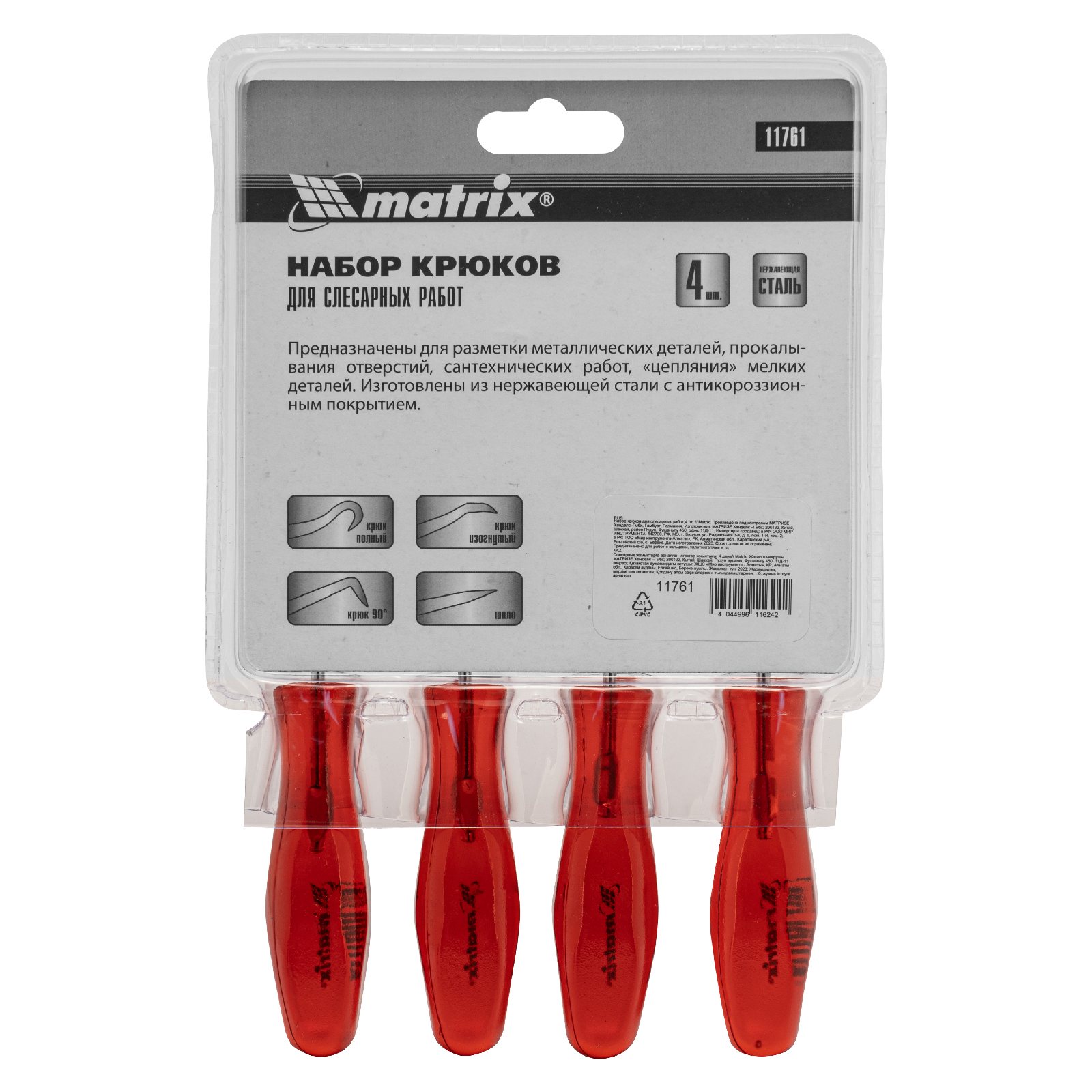 Набор крюков для слесарных работ Matrix 11761 состоит из 4 предметов длиной 155 мм — шила, полного и углового крюков, а также крюка на 90°. Набор позволяет решать разнообразные бытовые и профессиональные задачи: снимать уплотнительные кольца и сальники, размечать металлические детали, проделывать отверстия в коже, дереве и других материалах. Инструменты будут полезны при выполнении строительных, слесарных и столярных работ, пригодятся в автосервисе, а также дома или на даче.