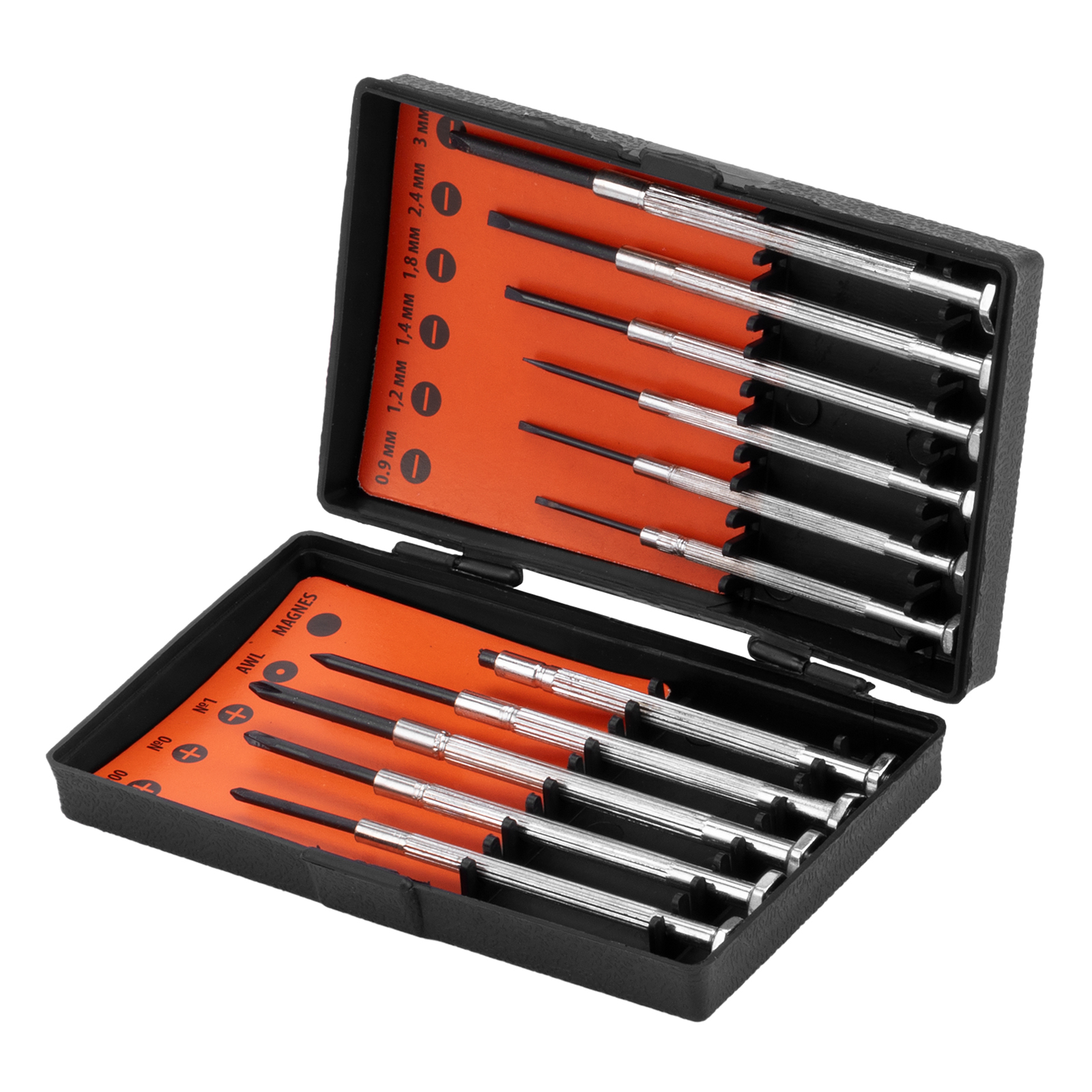 Набор отверток Sparta 133605, 11 предметов, используется для точной механики при осуществлении монтажа/демонтажа микровинтов со шлицами SL и PH. Он рассчитан на несложные бытовые работы, может применяться в частной мастерской. С помощью набора легко ремонтировать мелкие бытовые приборы, очки, часы и т.д.