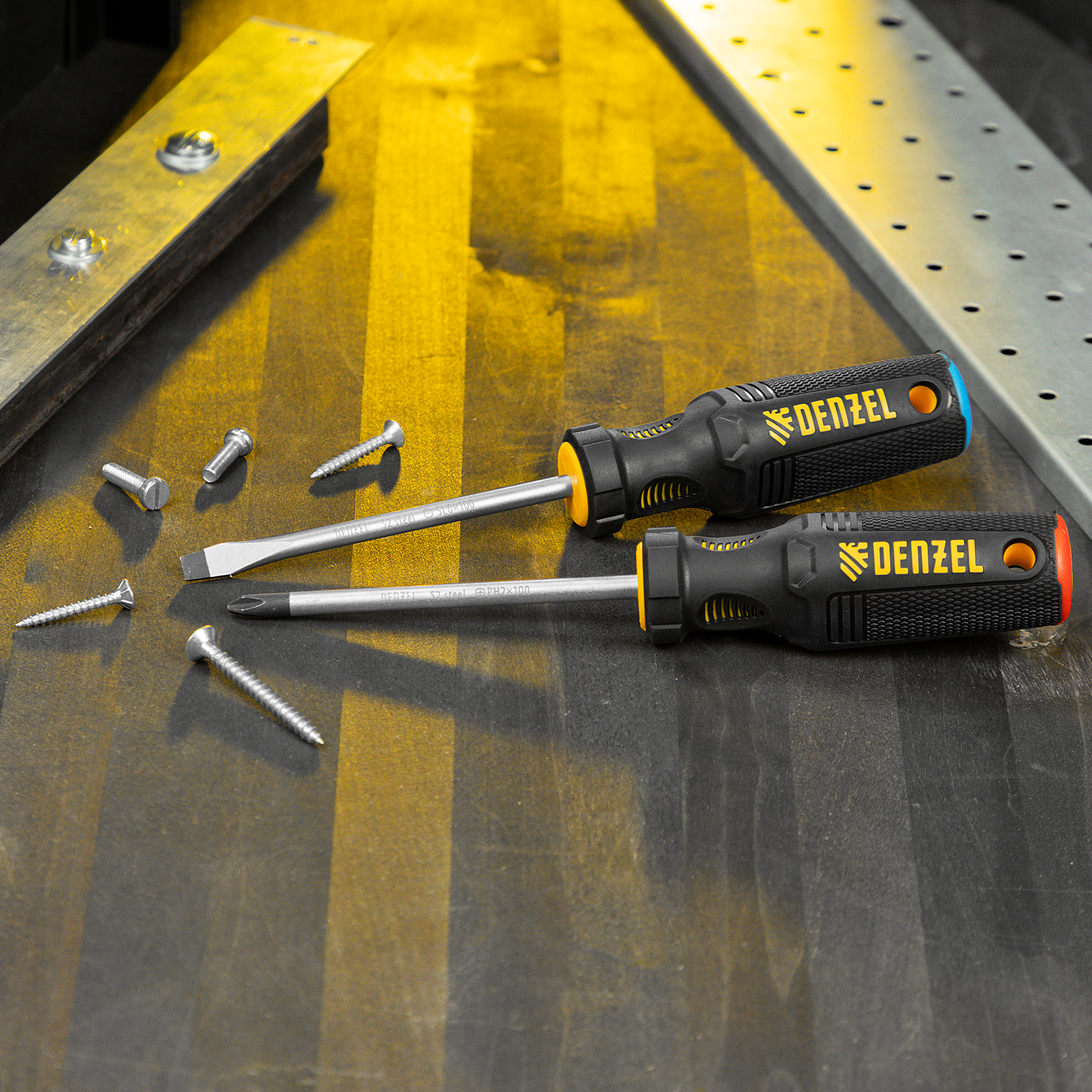 Комбинированный набор Denzel 122117 состоит из 2 отверток типоразмеров PH2 и SL6 длиной 100 мм, изготовленных из стали S2, с трехкомпонентными рукоятками. Намагниченные высокоточные шлицы позволяют направлять отвертку с крепежом одной рукой, а другой придерживать закрепляемую деталь. Набор предназначен для выполнения профессиональных монтажных и демонтажных работ с резьбовыми соединениями.