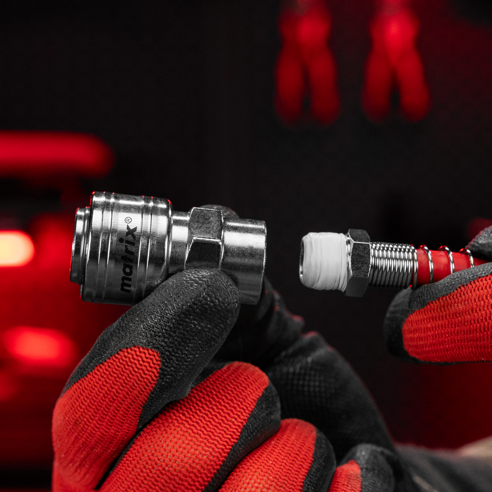 Набор переходников Matrix 57016 обеспечивает подключение элементов пневмосистемы с разным типом крепления. Он позволяет просто перейти с быстросъемного соединения на резьбовое и надежно соединить компрессор с пневматическим инструментом. Набор состоит из двух аксессуаров: ниппеля Rapid (Euro) типа «папа» и муфты Rapid (Euro) типа «мама» с диаметром внутренней резьбы 1/4″.