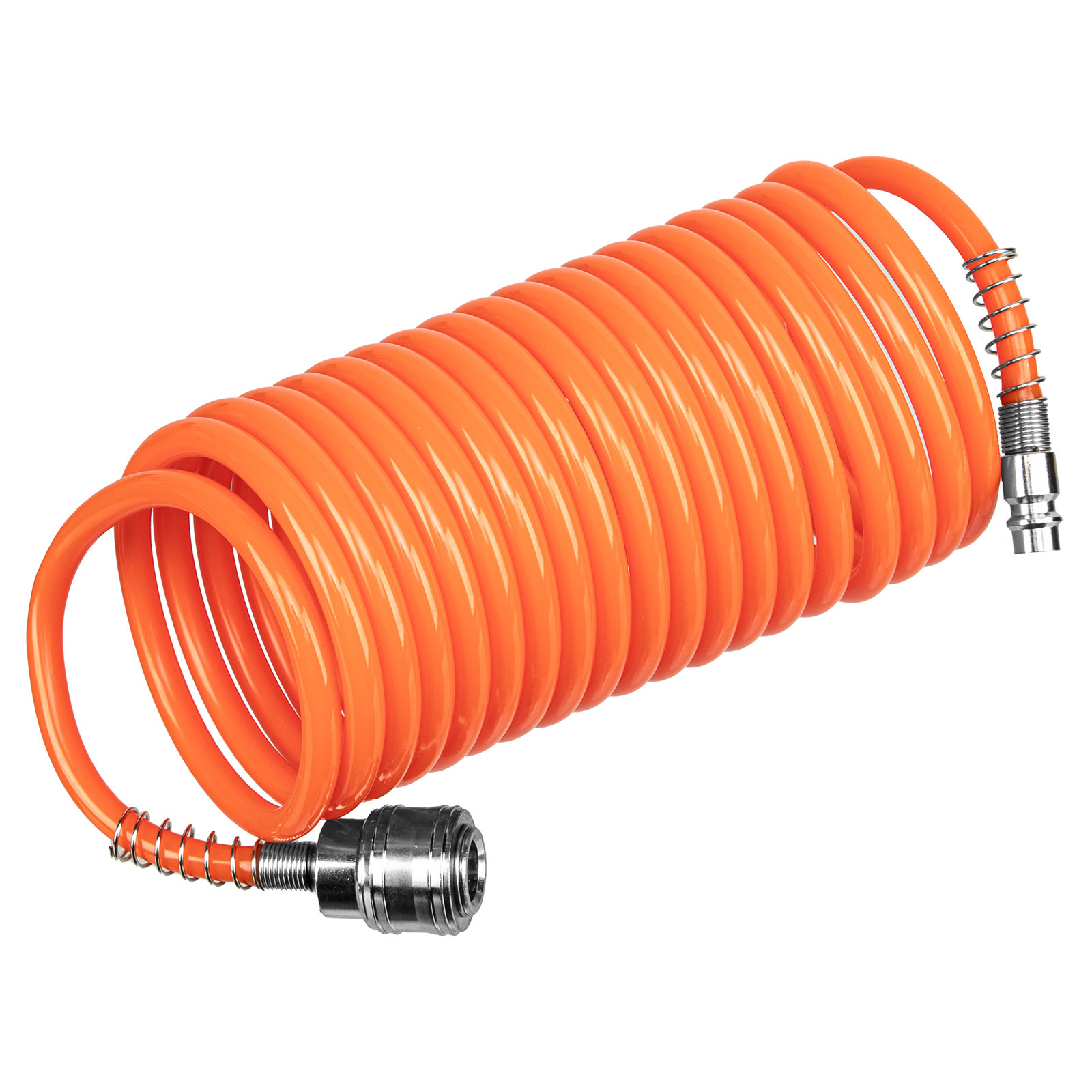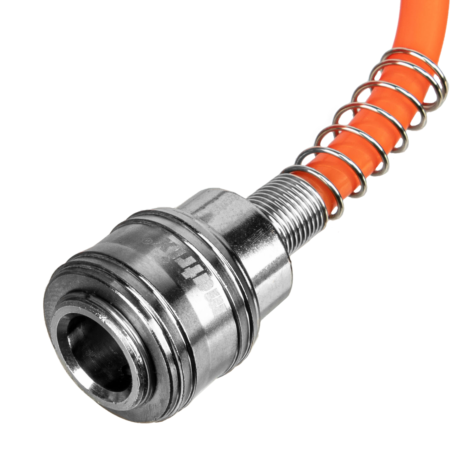 - Удобное использование — спиральный шланг не перегибается и не нуждается в скручивании после окончания работ, а его длины 5 м достаточно для свободного передвижения по рабочей зоне.