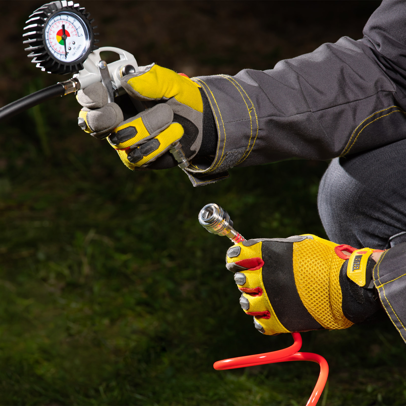 - Контроль давления — пистолет подкачки шин оснащен точным механическим манометром.