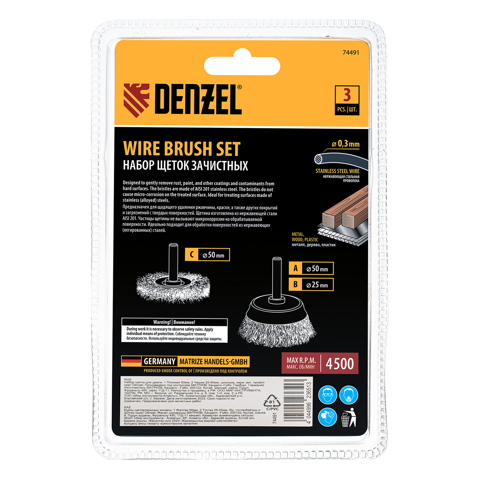 Набор щеток для дрели Denzel 74491 со шпилькой и щетиной из нержавеющей витой проволоки включает в себя 1 плоскую насадку диаметром 50 мм и 2 «Чашки» диаметром 25-50 мм. Набор используется для щадящей обработки твердых поверхностей: металла, стали (в том числе нержавеющей), древесины, пластика, позволяет удалять старые лакокрасочные покрытия, ржавчину и загрязнения. Щетки в форме чашки оптимальны для обработки плоских поверхностей большой площади, плоская насадка удобна для зачистки пазов, изгибов и углов.