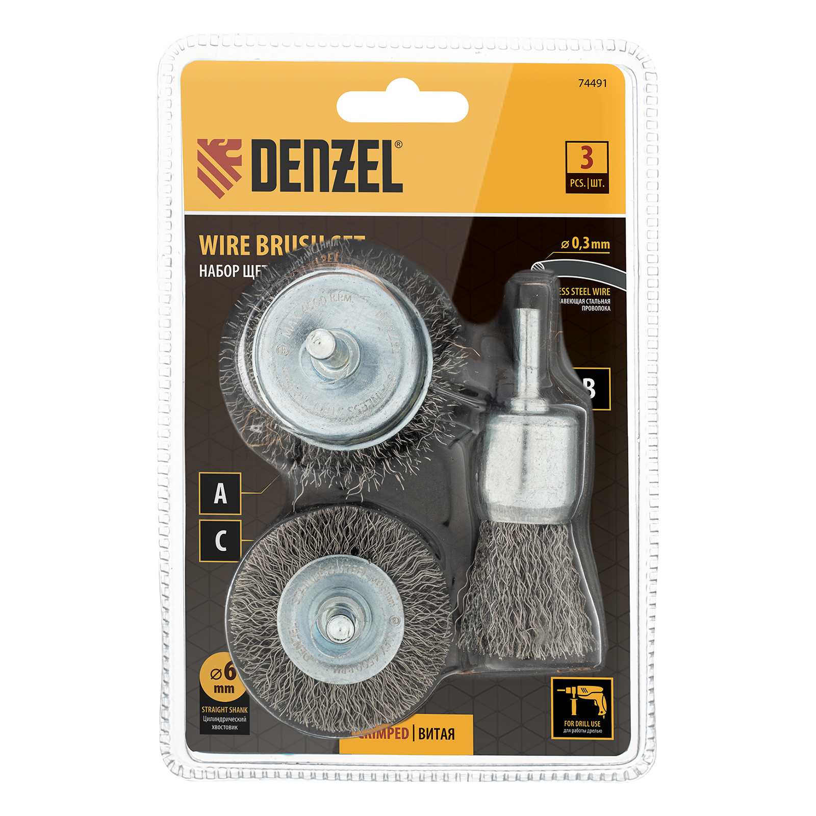 Набор щеток для дрели, 1 Плоская 50мм, 2 Чашки 25-50мм, шпилька, нерж. вит. проволока Denzel в Воронеже