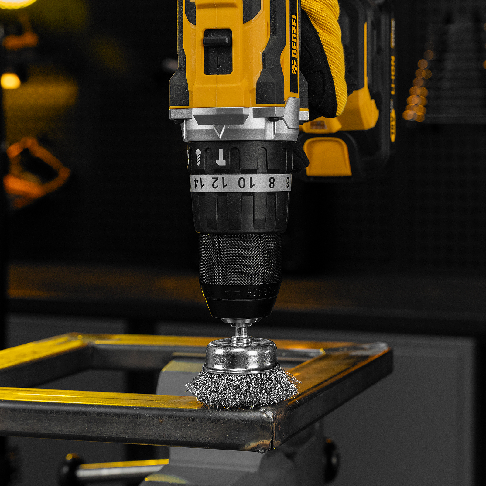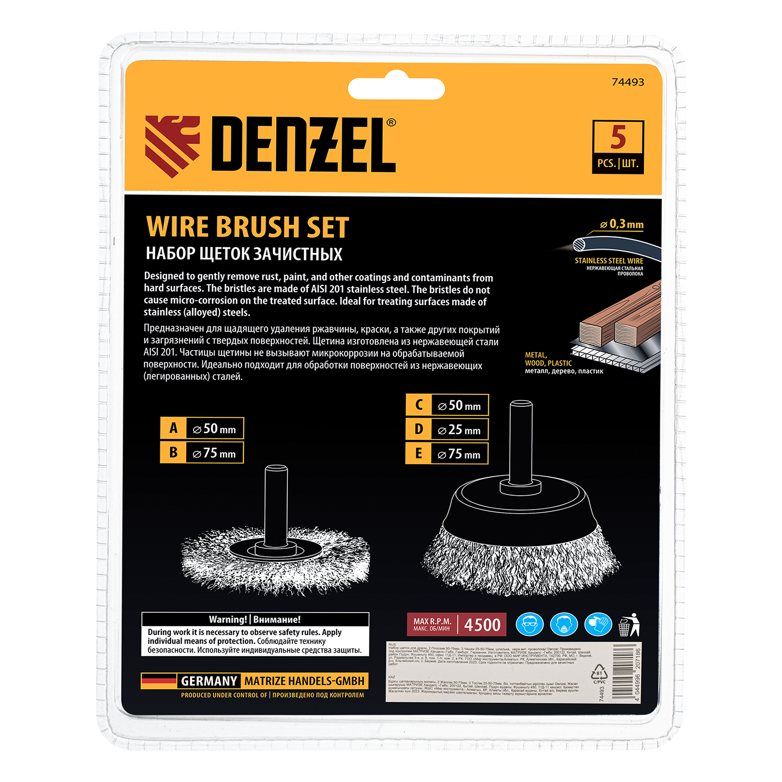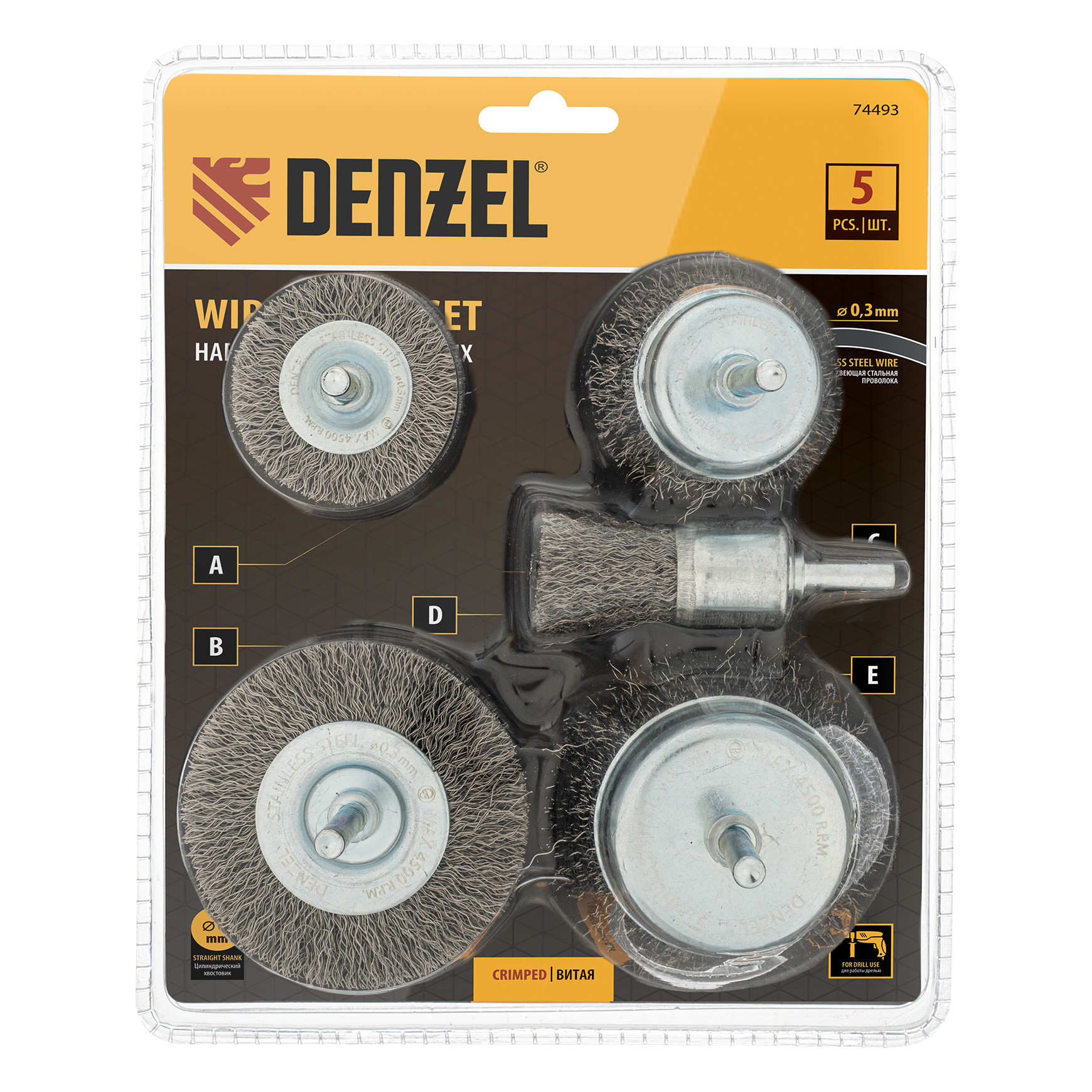 Набор щеток для дрели, 2 Плоские 50-75мм, 3 Чашки 25-50-75мм, шпилька, нерж.вит. проволока Denzel в Воронеже