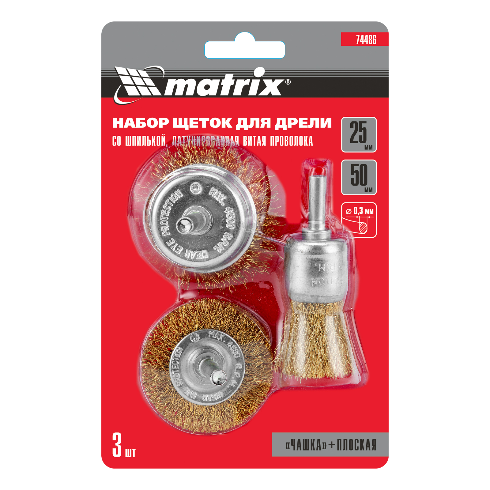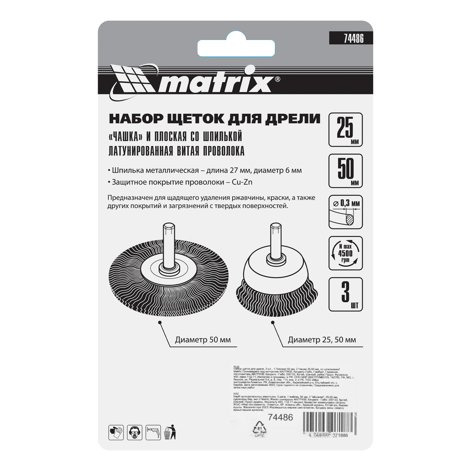 Набор щеток для дрели, 3 шт, 1 плоская, 50 мм, 2 "чашки", 25-50 мм, со шпильками Matrix в Воронеже