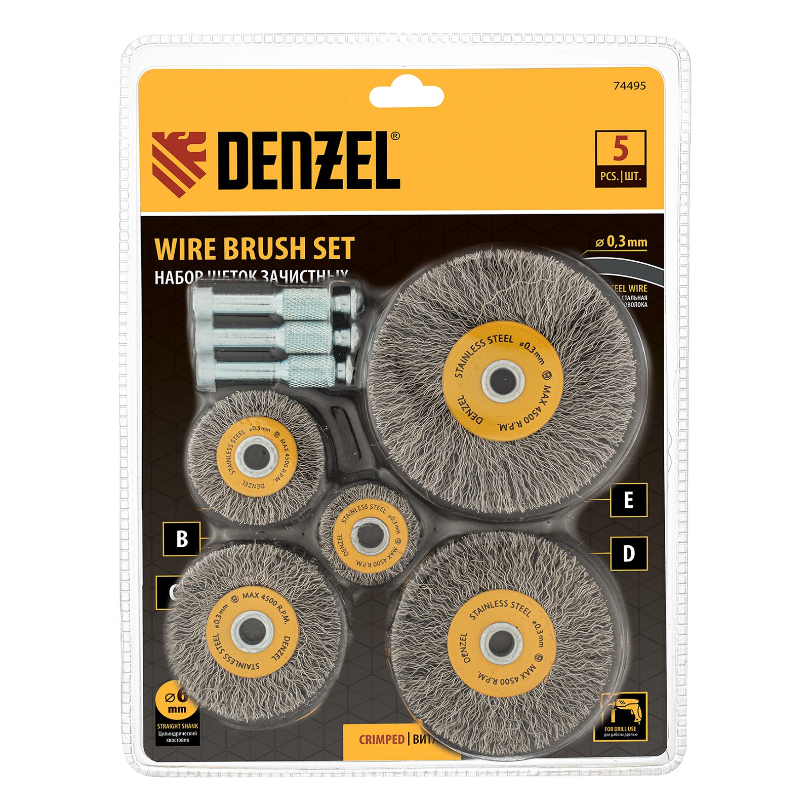 Набор щеток для дрели, 5 Плоских 25-38-50-63-75 мм, шпилька, нерж. вит. проволока Denzel в Воронеже