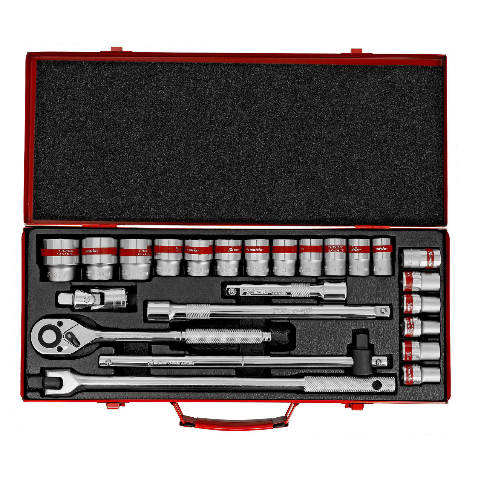 Набор Matrix 13582 состоит из 24 предметов с присоединительным квадратом 1/2" (торцевые головки, трещотка, удлинители. воротки, кардан), необходимых для проведения слесарно-монтажных работ любой сложности. 18 шестигранных торцевых головок диаметром от 10 до 32 мм позволяют решать широкий спектр задач. Воротки, удлинители и шарнирный кардан облегчают работу в труднодоступных местах. Набор пригодится автолюбителям и работникам автосервисов.