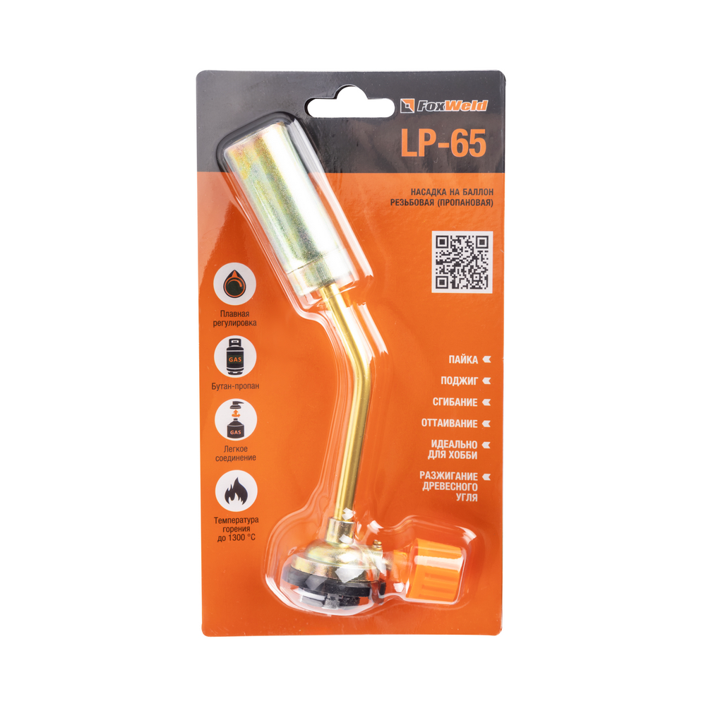 Насадка на баллон без резьбы FOXWELD LP-65 (пропановая) предназначена для пайки твёрдым и мягким припоем, оттаивания, поджига, сгибания и разжигания древесного угля. Насадка оснащена системой безопасности, позволяющей использовать её в наклонном и перевернутом положении от начала и до окончания работ. Это оборудование должно использоваться исключительно с клапанными газовыми баллонами, байонетного типа (в комплект поставки не входит).МНОГОФУНКЦИОНАЛЬНОСТЬ 7-В-1Насадку на баллон можно применять для пайки твёрдым и мягким припоем, горелка поможет нагреть и отвернуть «прикипевшую» гайку, согнуть металлическую или пластиковую трубу, запаять металл или пластик. Насадка применима и в быту: поможет разжечь мангал и костёр даже сырыми дровами, открыть замёрзший замок, быстро разогреть дымоход дровяной печи или камина для появления тяги. Многофункциональная горелка работает от портативного газового баллончика и оборудована регулятором подачи газа.ПРЕИМУЩЕСТВА:Работает от сменного баллона на жидком газе со стандартным цанговым соединением (пропан-бутановая смесь)Неоценимый помощник в хозяйстве и в дороге, в мастерской и на пикнике, летом и зимойПредназначена для прогрева, плавки и сварки пластиковых частей, нагрева малых металлических частей, плавки металла с низкой температурой плавления, сгибания тонких стеклянных трубокЛёгкое цанговое соединениеПлавная регулировка подачи газаТемпература горения до 1300 °С