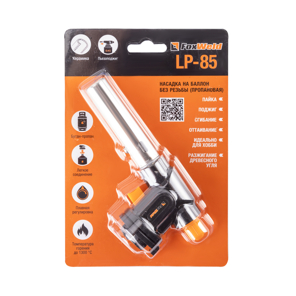 Насадка на баллон без резьбы FOXWELD LP-85 (пропановая) предназначена для пайки твёрдым и мягким припоем, оттаивания, поджига, сгибания и разжигания древесного угля. Насадка оснащена системой безопасности, позволяющей использовать её в наклонном и перевернутом положении от начала и до окончания работ. Это оборудование должно использоваться исключительно с клапанными газовыми баллонами, байонетного типа (в комплект поставки не входит).МНОГОФУНКЦИОНАЛЬНОСТЬ 7-В-1Насадку на баллон можно применять для пайки твёрдым и мягким припоем, горелка поможет нагреть и отвернуть «прикипевшую» гайку, согнуть металлическую или пластиковую трубу, запаять металл или пластик. Насадка применима и в быту: поможет разжечь мангал и костёр даже сырыми дровами, открыть замёрзший замок, быстро разогреть дымоход дровяной печи или камина для появления тяги. Многофункциональная горелка работает от портативного газового баллончика и оборудована регулятором подачи газа.ПРЕИМУЩЕСТВА:Работает от сменного баллона на жидком газе со стандартным цанговым соединением (пропан-бутановая смесь)Неоценимый помощник в хозяйстве и в дороге, в мастерской и на пикнике, летом и зимойПредназначена для прогрева, плавки и сварки пластиковых частей, нагрева малых металлических частей, плавки металла с низкой температурой плавления, сгибания тонких стеклянных трубокЛёгкое цанговое соединениеПлавная регулировка подачи газаТемпература горения до 1300 °СПьезоподжиг