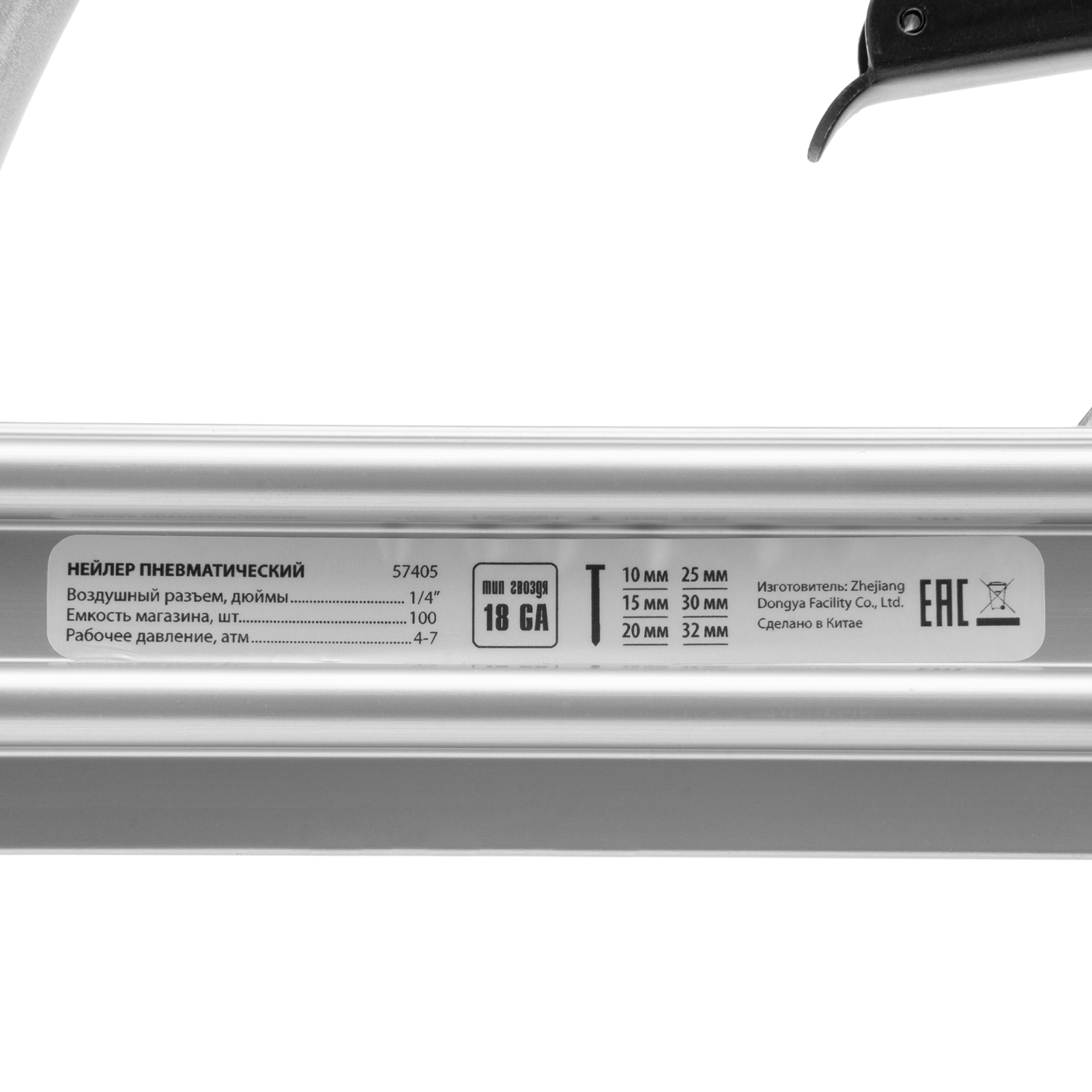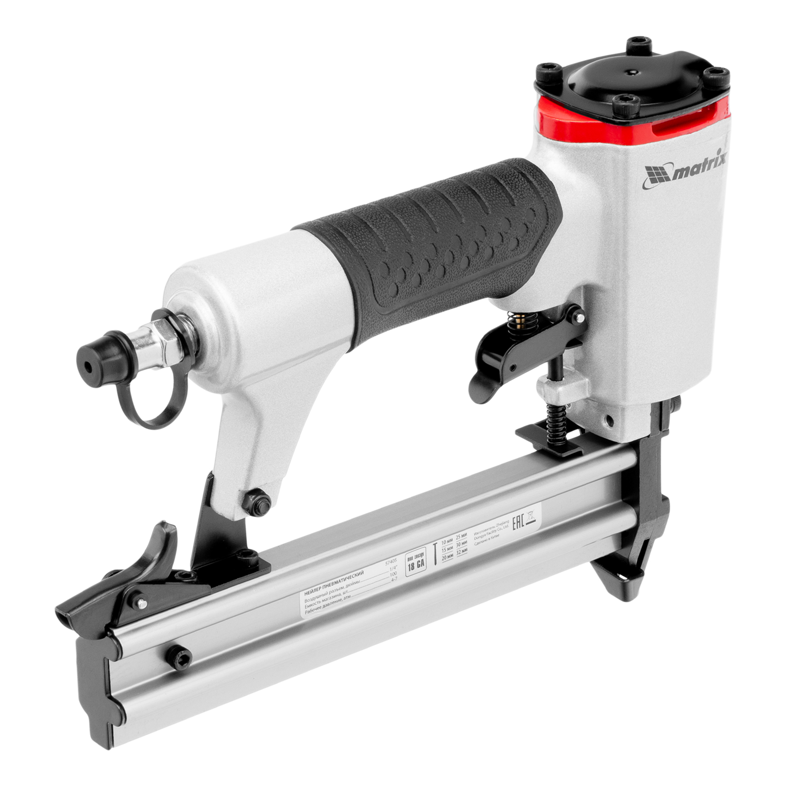 Пневматический нейлер Matrix 57405 предназначен для гвоздей 18GA длиной от 10 до 32 мм. Применяется во время строительства и ремонта, кровельных работ и производства мебели. С помощью нейлера можно закрепить паркетную доску, фанеру, ДВП, шифер, гипсокартон, ткань и бумагу.