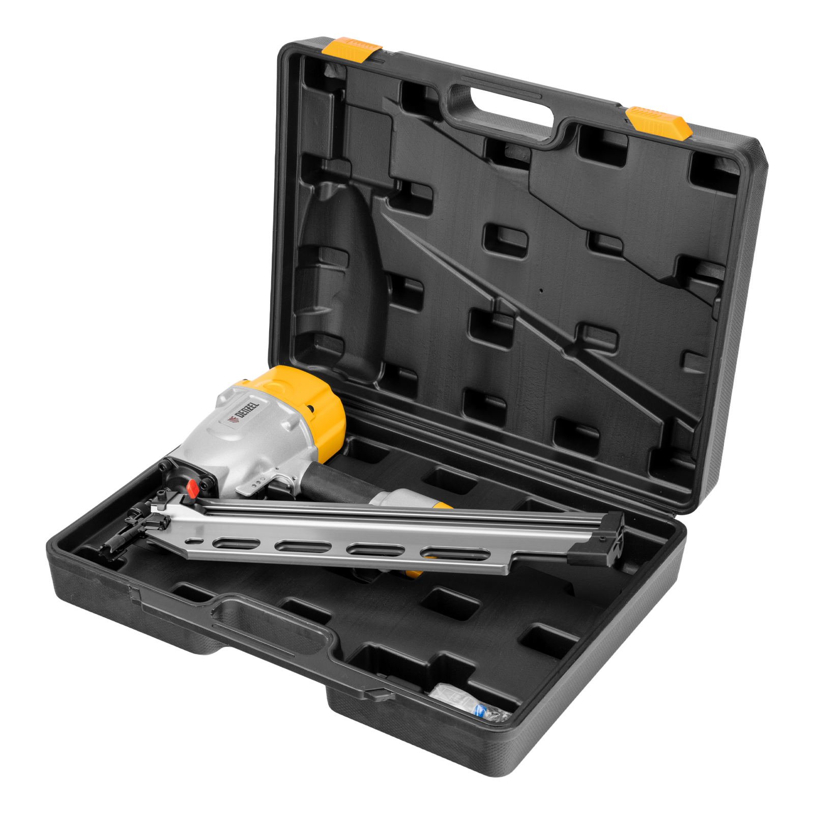 - Удобное хранение и транспортировка — нейлер поставляется в прочном пластиковом кейсе.