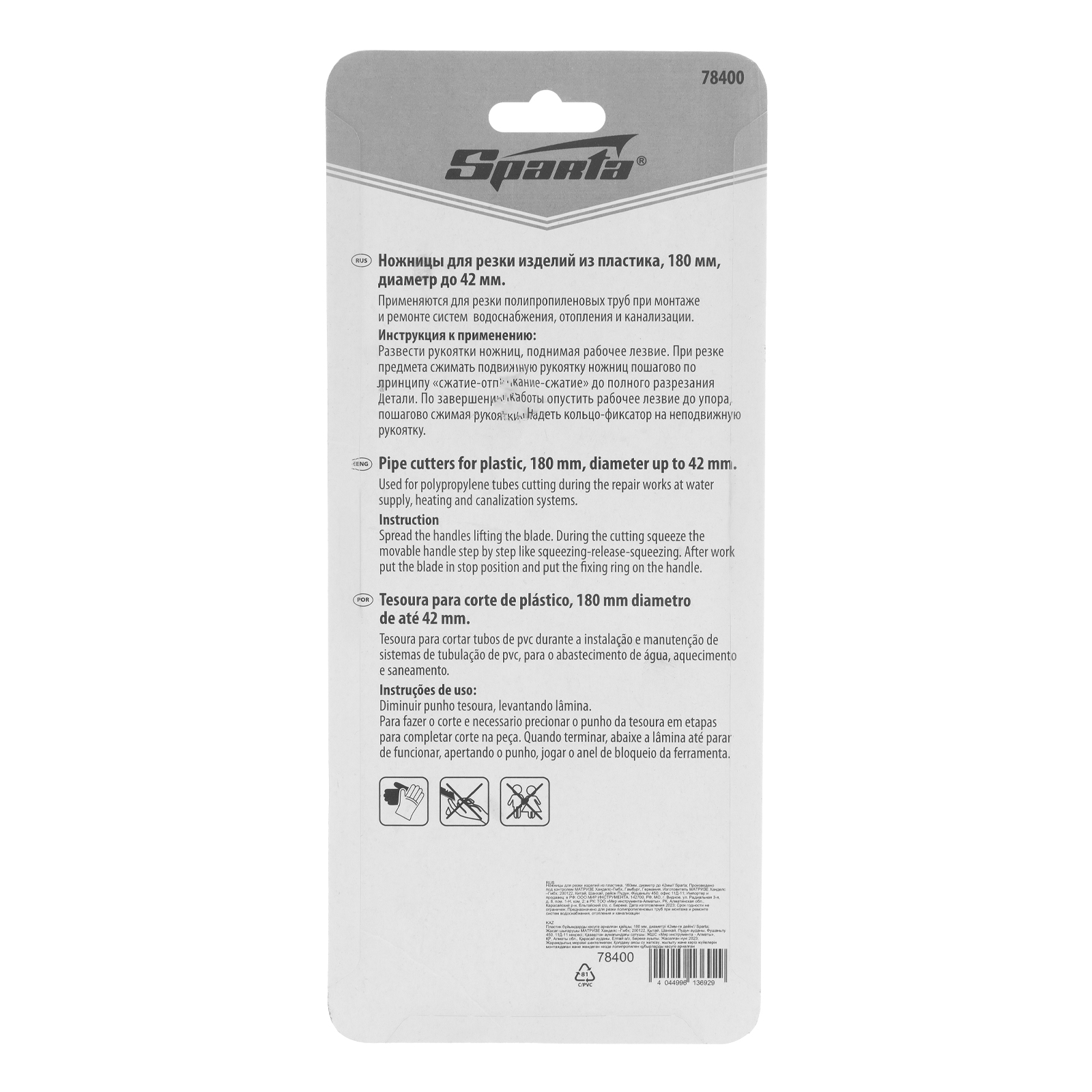 Ножницы Sparta 78400 длиной 180 мм предназначены для резки изделий из пластика диаметром до 42 мм. Храповой механизм увеличивает эффективность реза, экономя усилия мастера. Ножницы используются для ремонта и монтажа трубопроводных систем.