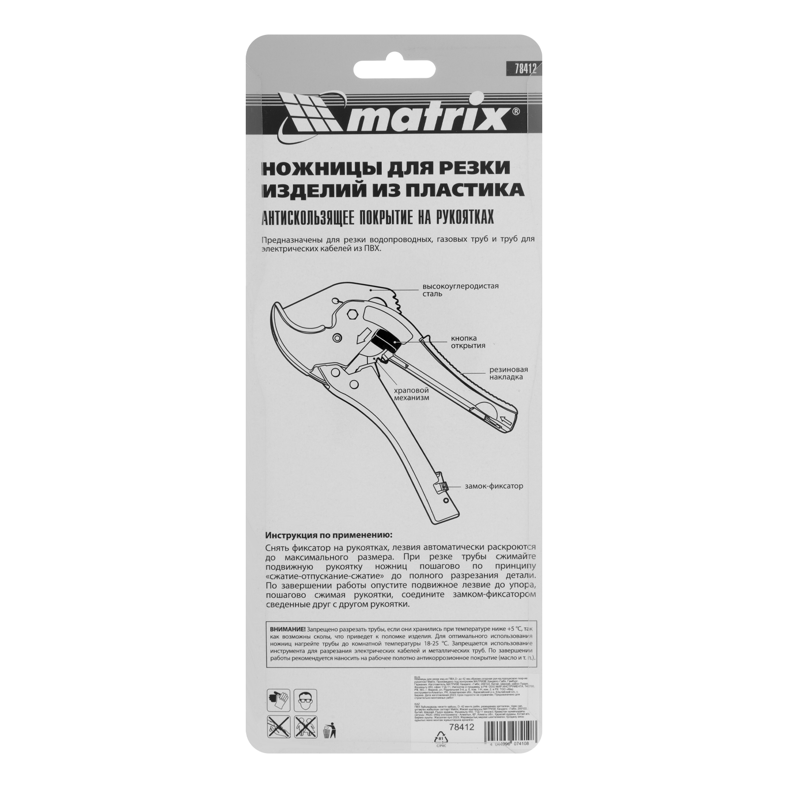 Ножницы для резки изделий из ПВХ, D до 42 мм, обрезиненная опорная рукоятка, порошковое покрытие рукояток Matrix в Воронеже