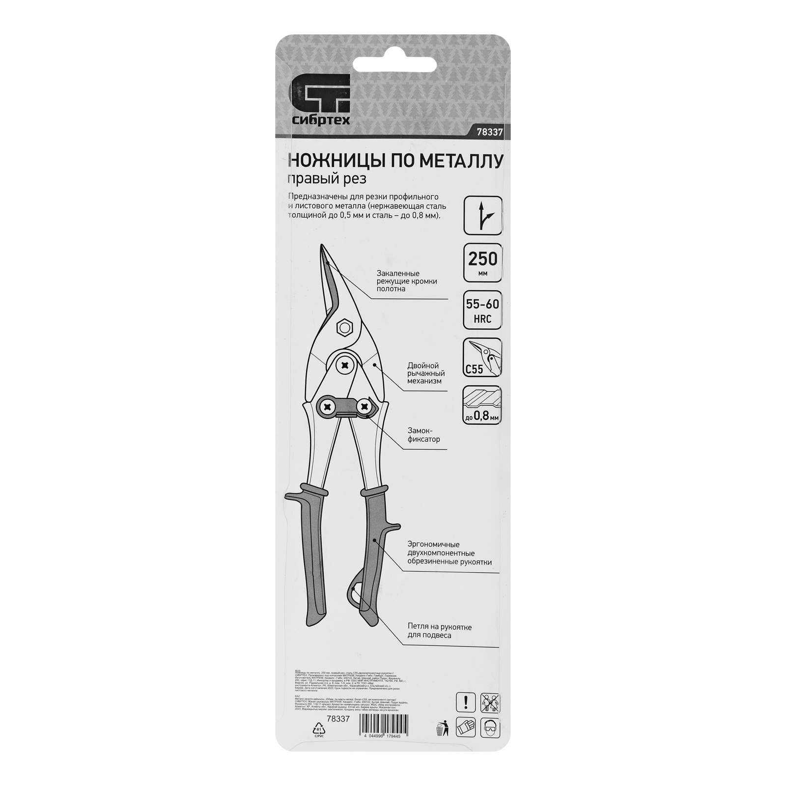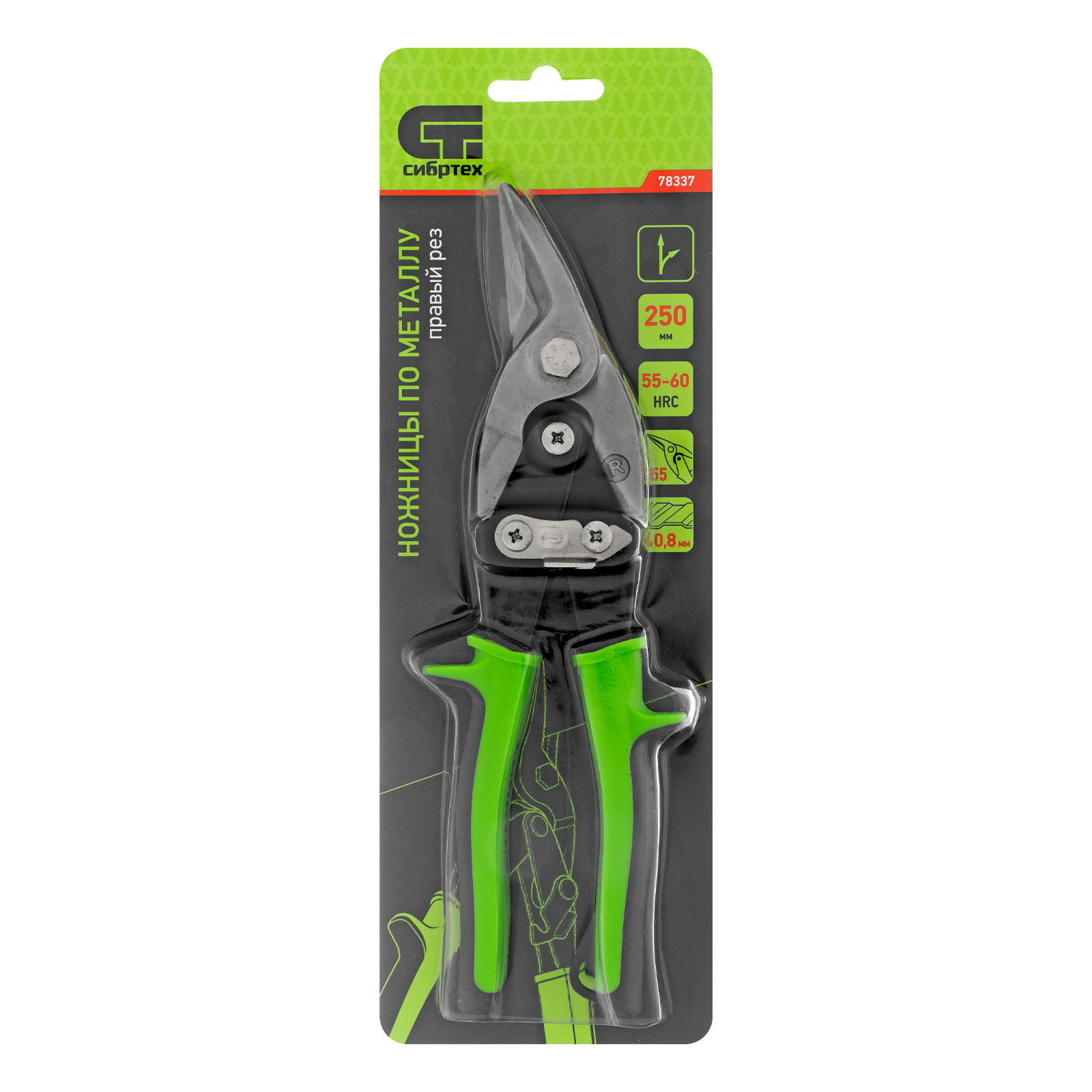 Ножницы Сибртех 78337 длиной 250 мм, из стали С55, с двухкомпонентными рукоятками, используются для правого реза профильного и листового металла. Предназначены для проведения ремонтных и монтажных работ с материалами толщиной до 0,8 мм.