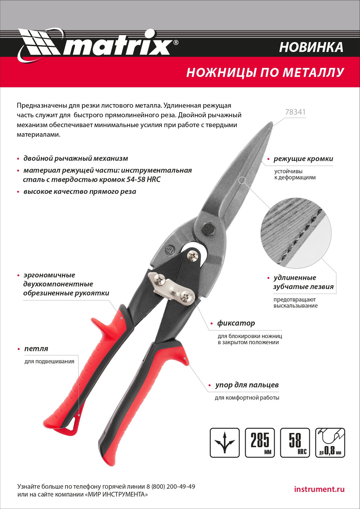 Удлиненные пряморежущие ножницы Matrix 78341 длиной 290 мм, с 2-компонентными обрезиненными рукоятками, предназначены для работ по листовому металлу толщиной до 0,8 мм. Двойной рычажный механизм обеспечивает максимальное усилие реза при минимальных усилиях мастера. Удлиненная рабочая часть позволяет быстрее справляться с поставленными задачами. Инструмент пригодится для бытового и полупрофессионального применения.
