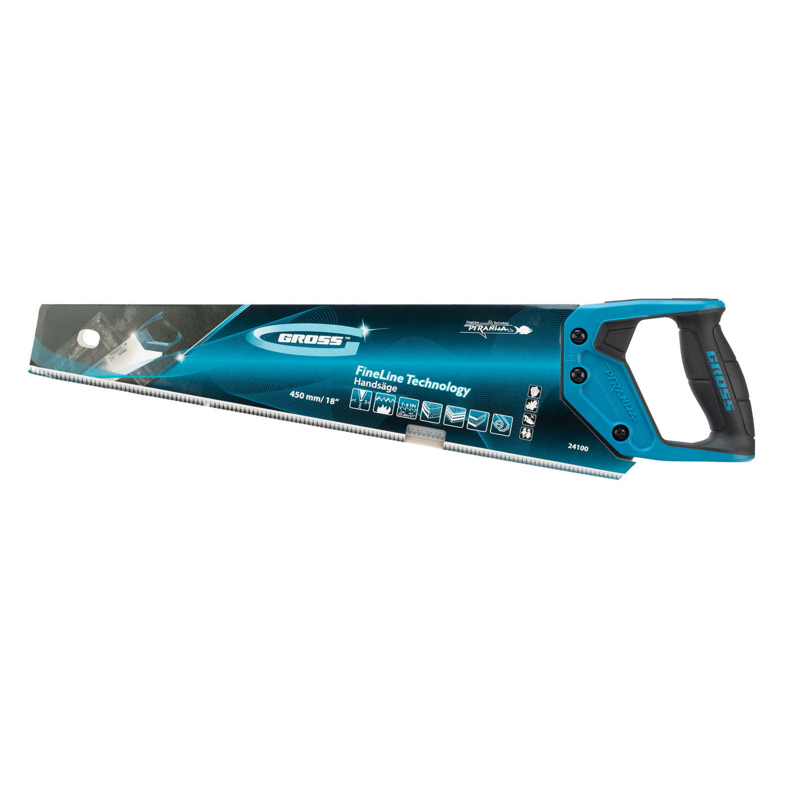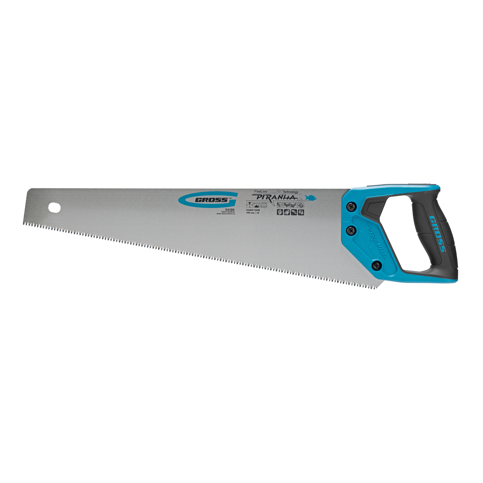 Ножовка по дереву Gross PIRANHA 24100 с полотном длиной 450 мм, калеными зубьями с 3D-заточкой и шагом 7-8 TPI, 2-компонентной рукояткой, используется для распиливания древесины, МДФ, ДСП, ДВП, ламината, а также пенополистирола, полиуретана и других пластических материалов. Подходит для продольного и поперечного пиления. Зубья имеют универсальный шаг 7-8 TPI, поэтому ножовка подходит для решения широкого спектра задач. Трехгранная заточка зубьев обеспечивает максимальную производительность и высокое качество пиления. Ножовка предназначена для столярных и плотницких работ, пригодится во время ремонта и будет полезна в быту.