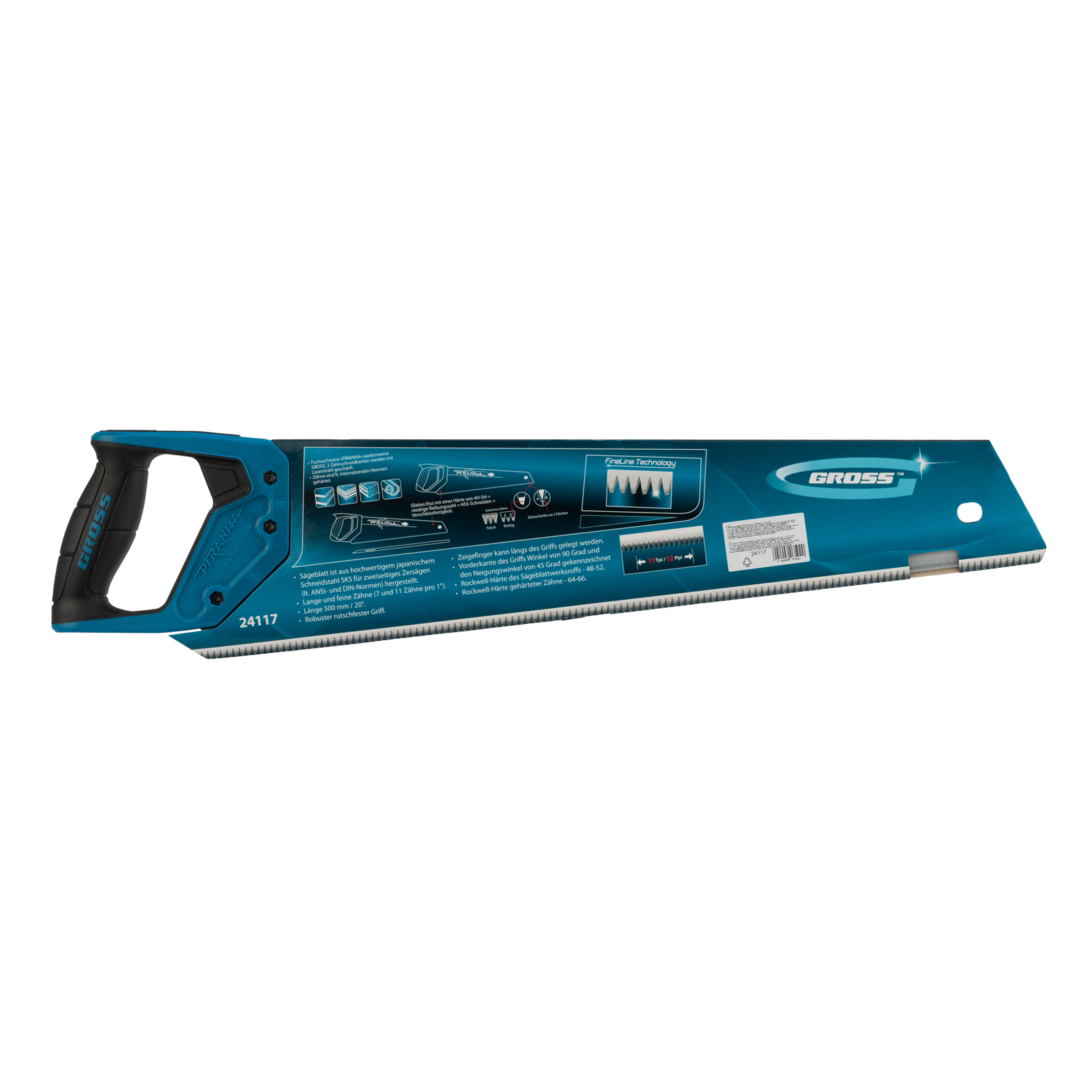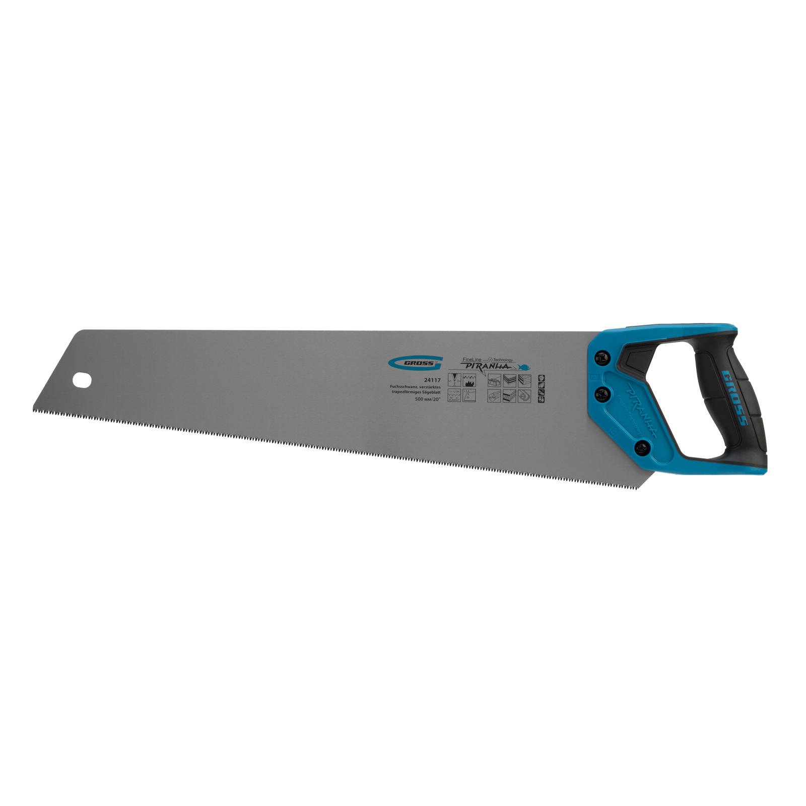 Ножовка по дереву Gross PIRANHA 24117 с усиленным трапециевидным полотном длиной 500 мм, калеными зубьями с 3D-заточкой и шагом 11-12 TPI, с двухкомпонентной рукояткой, используется для выполнения столярных работ. Ей пилят древесину различных пород, МДФ, ДСП, ДВП, ламинат, а также пенополистирол, полиуретан и другие синтетические материалы. Ножовка подходит для продольного и поперечного пиления. Благодаря мелким зубьям с шагом 11-12 TPI выполняет точный и чистый рез. Инструмент рекомендован для профессионального применения, но может использоваться и в быту.