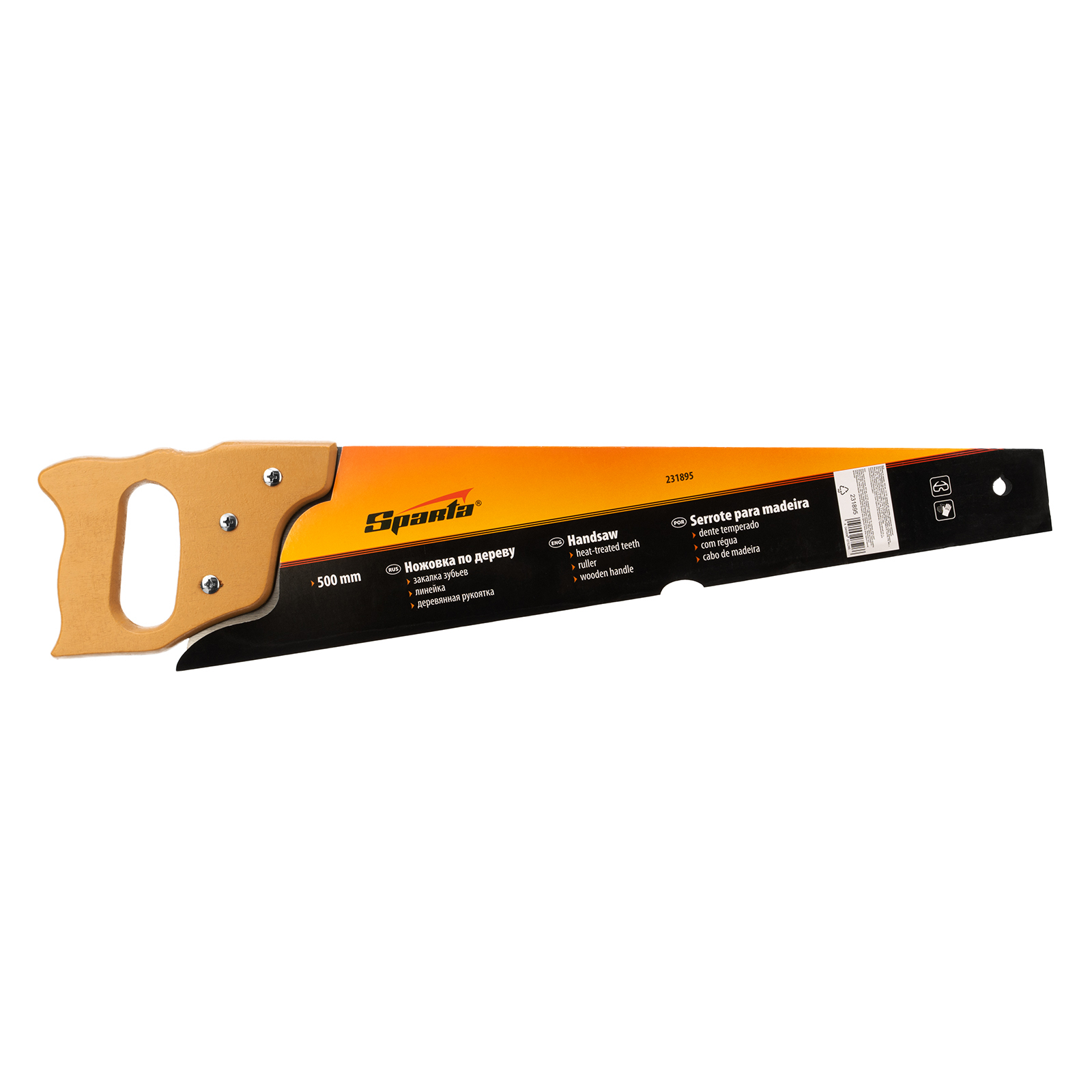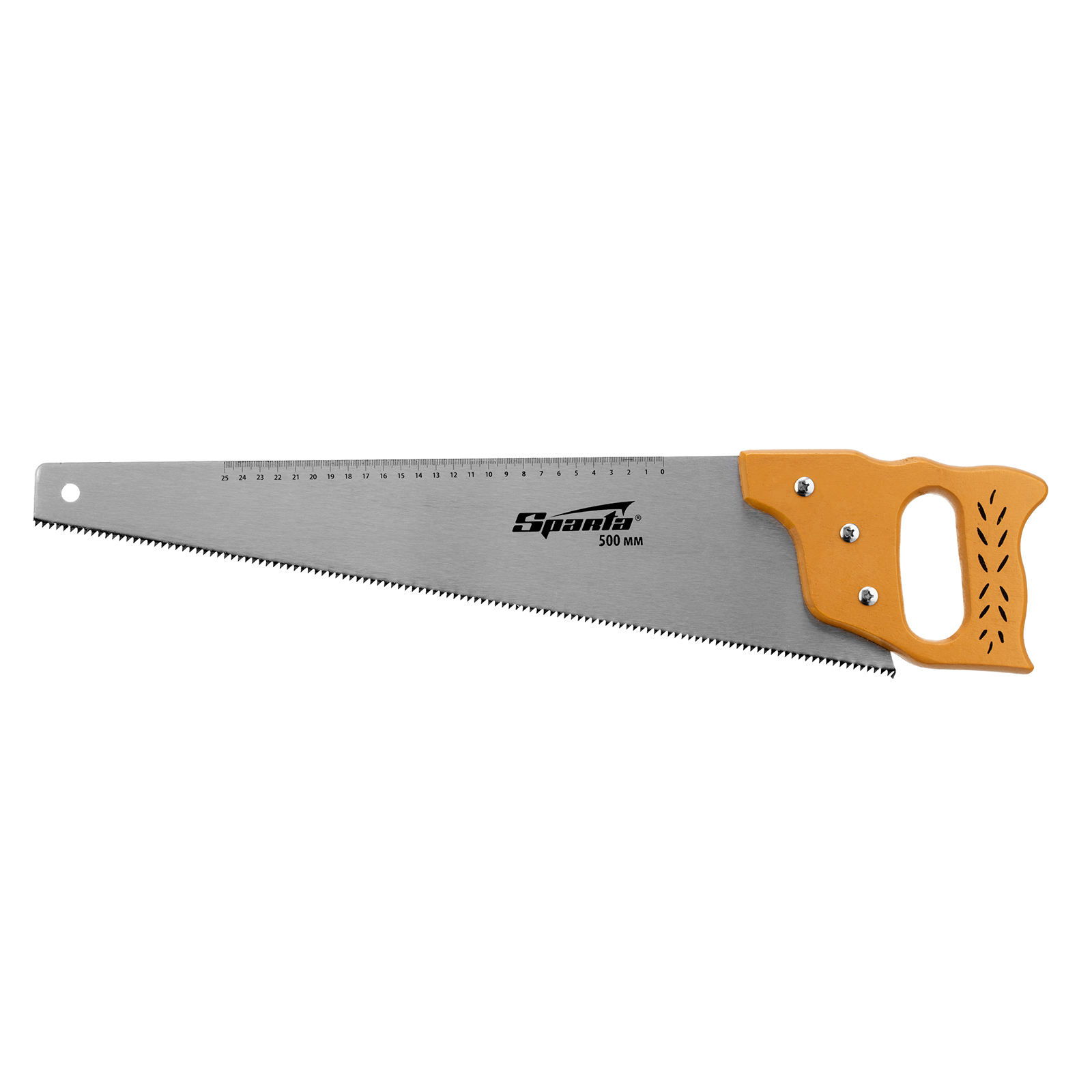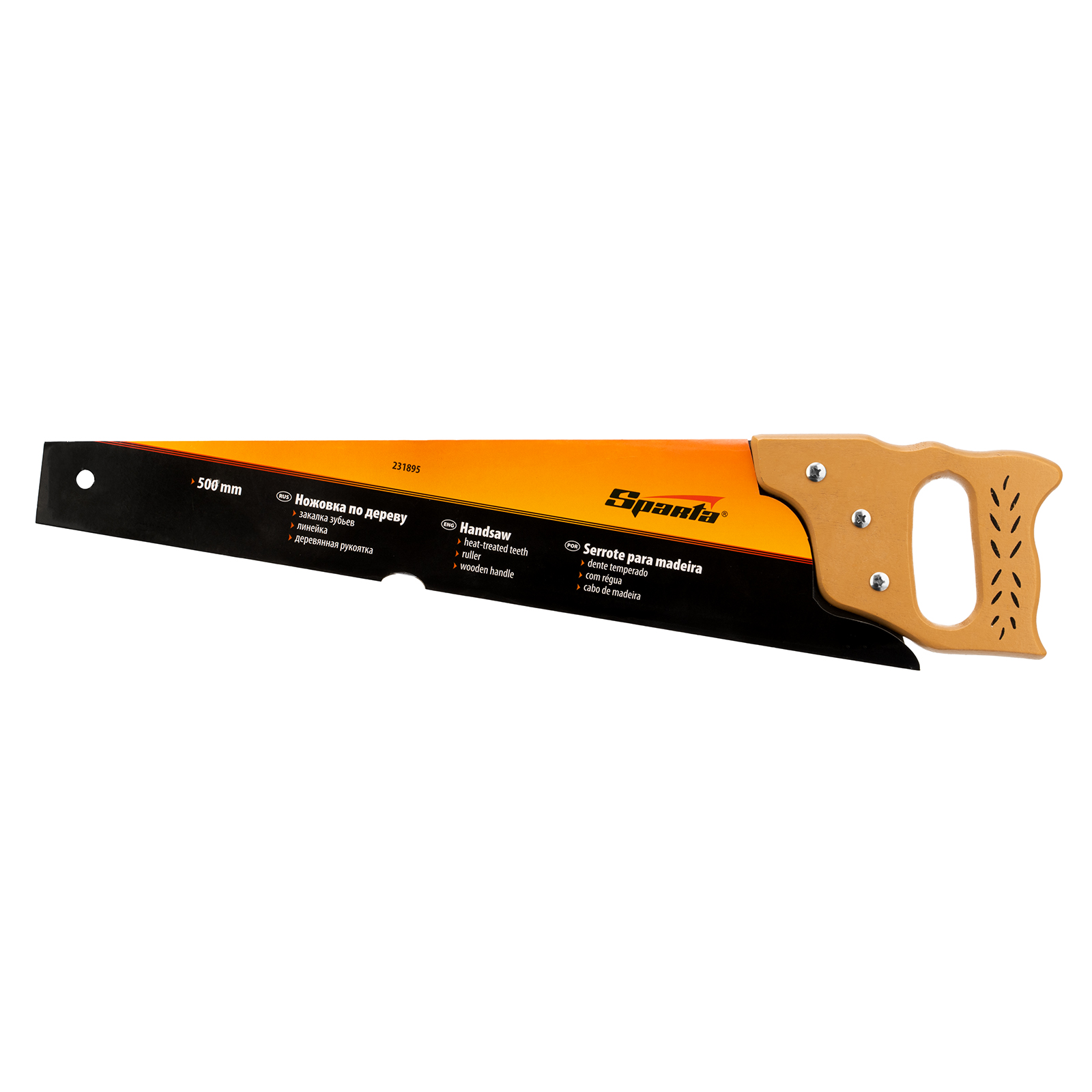 Ножовка по дереву Sparta 231895 с полотном длиной 500 мм, с калеными зубьями с шагом 7-8 TPI, с линейкой и деревянной рукояткой, предназначена для продольно-поперечного распиливания древесины. Благодаря зубьям с 2D-заточкой подходит для двухстороннего реза. Режущую кромку можно перетачивать. На полотно нанесена измерительная шкала, позволяющая производить замеры, не тратя время на поиск линейки. Ножовка используется в столярном и плотницком деле, а также полезна дома и на даче.
