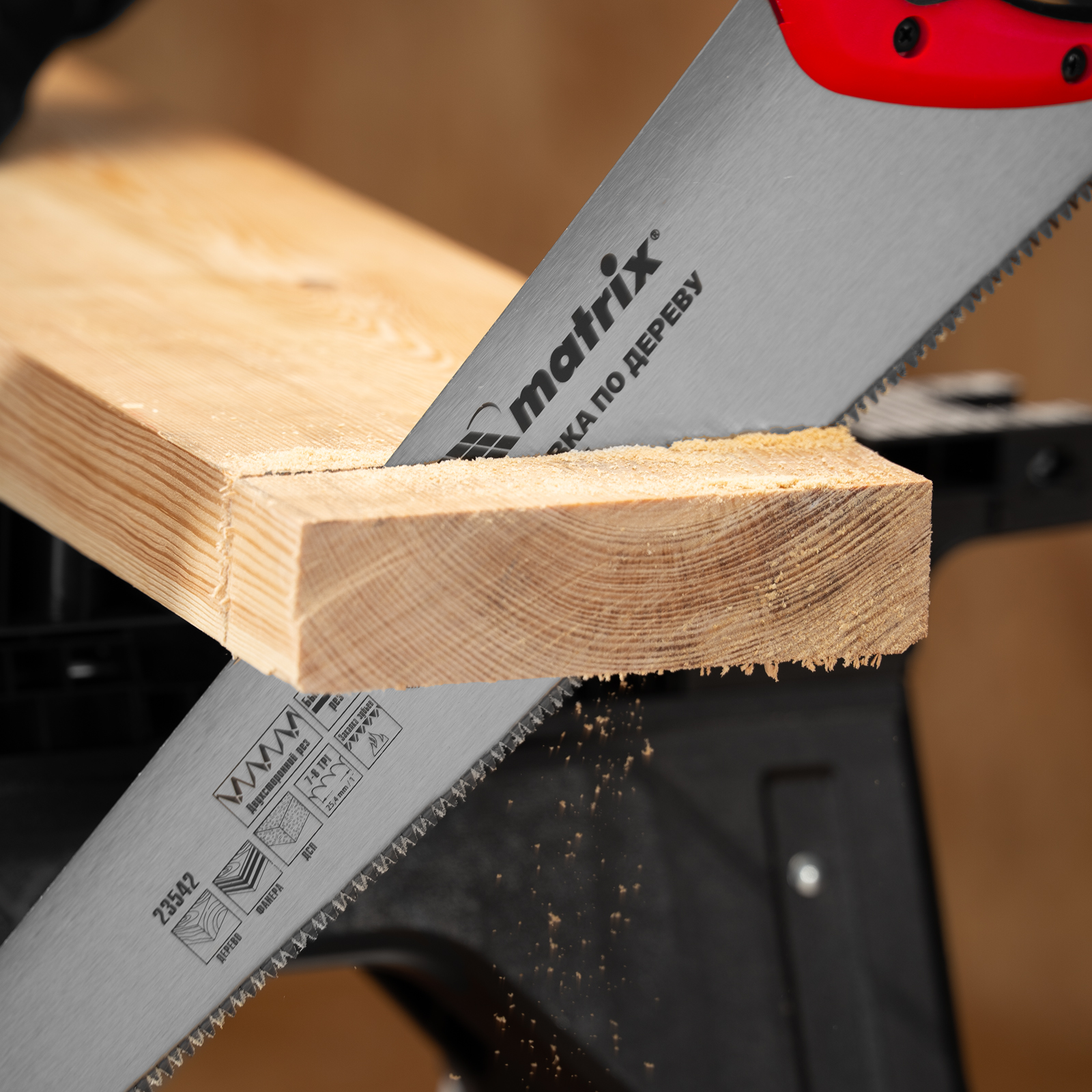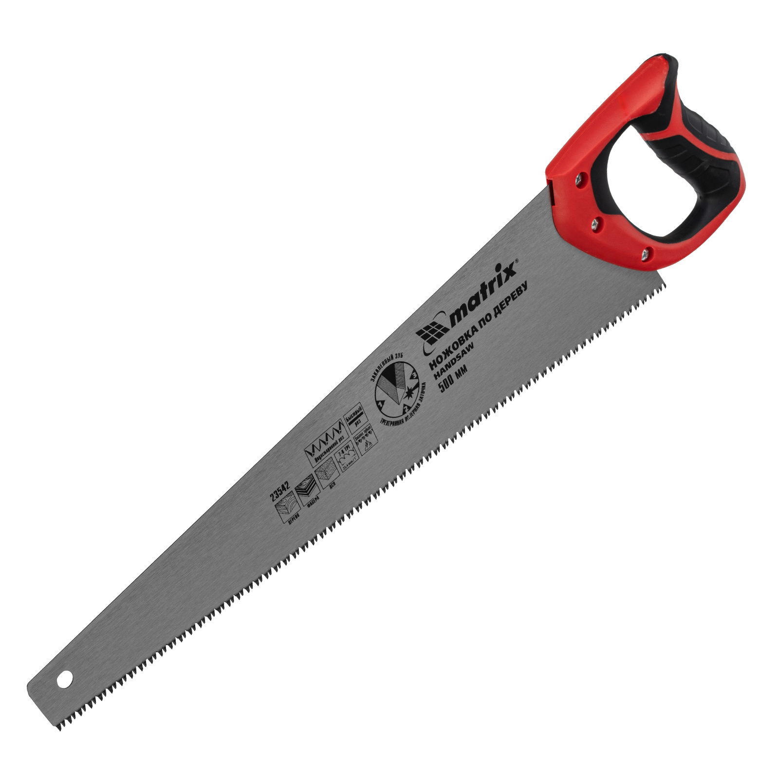 Ножовка по дереву Matrix 23542 с полотном длиной 500 мм, с калеными зубьями с 3D-заточкой и шагом 7-8 TPI, с двухкомпонентной рукояткой, используется для продольного и поперечного пиления досок, брусков, листов фанеры, ДСП. Благодаря трехгранной заточке зубьев пила характеризуется высокой производительностью. Шаг зубьев составляет 7-8 TPI, что обеспечивает быстрый и качественный рез. Ножовка пригодится в столярной мастерской, а также будет полезна в хозяйстве.