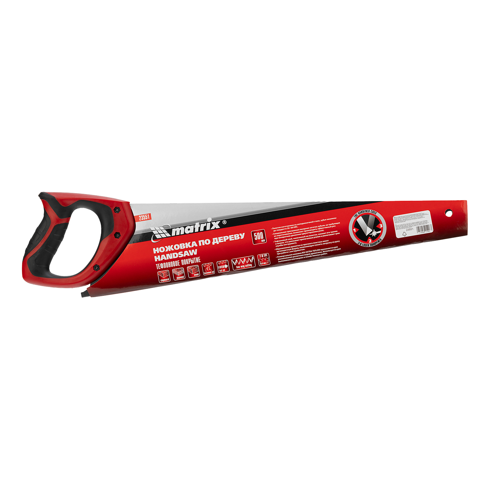 Ножовка по дереву Matrix 23551 с полотном длиной 500 мм, с калеными зубьями с шагом 7-8 TPI и 3D-заточкой, с тефлоновым покрытием полотна и 2-компонентной рукояткой, пилит древесину, фанеру и ДСП. Подходит для продольного и поперечного пиления, используется для быстрой распиловки заготовок. Трехгранная заточка зубьев обеспечивает инструменту повышенную производительность. Ножовка будет полезна столяру, плотнику, а также пригодится в домашнем хозяйстве.