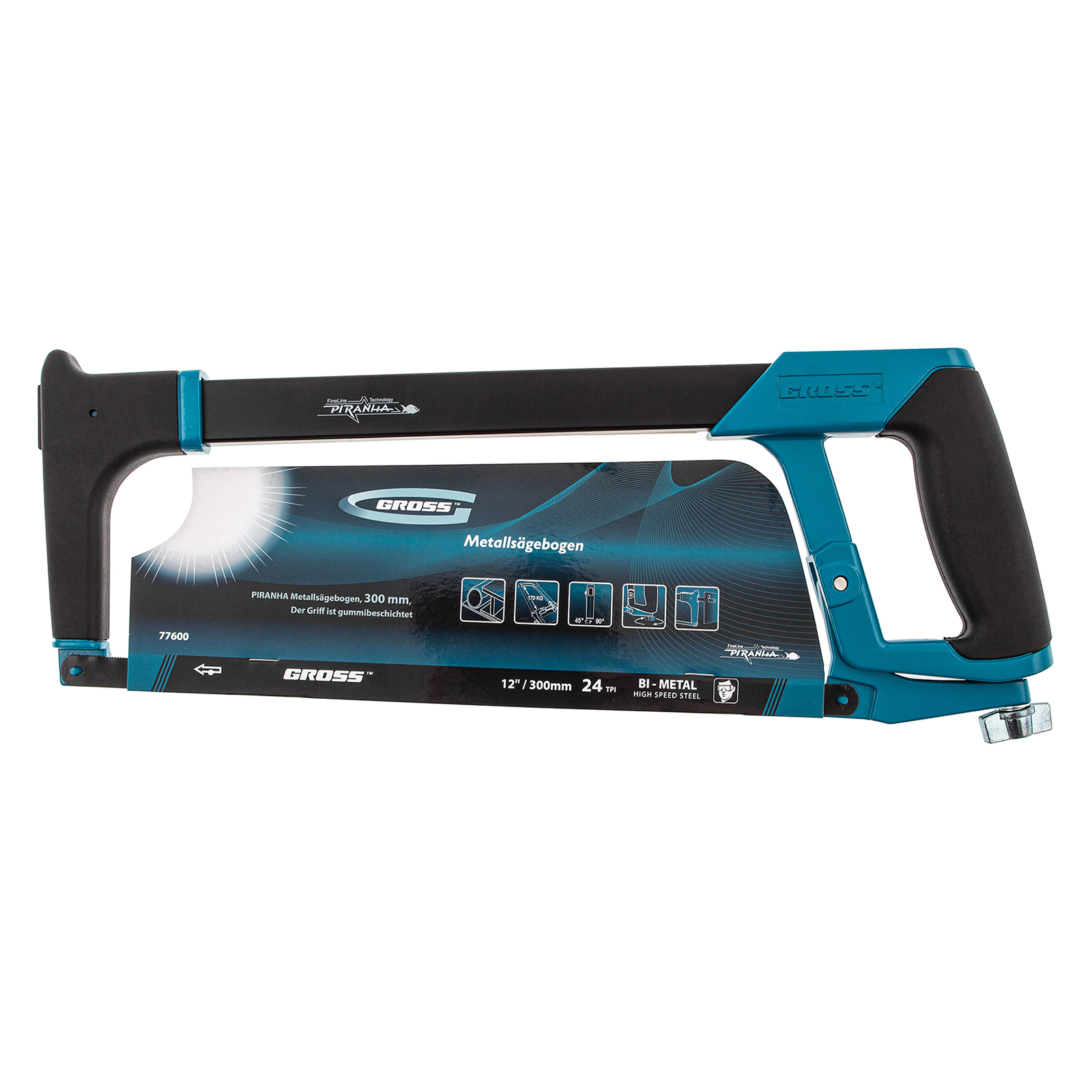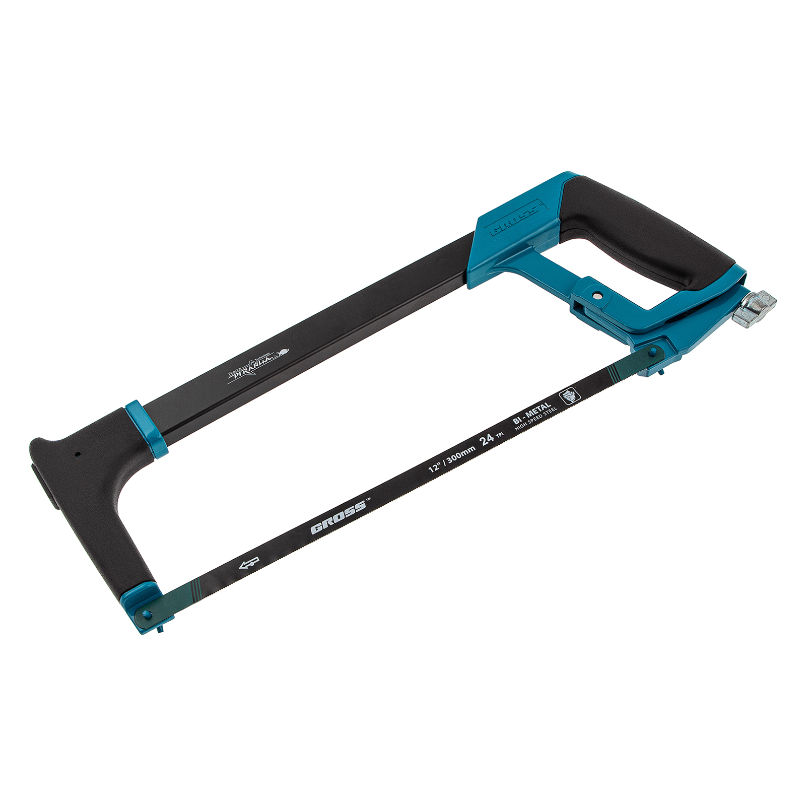 Ножовка Gross «PIRANHA» 77600 длиной 300 мм, с обрезиненной рукояткой и захватом, используется для работ по металлу. Рез получается точным и аккуратным за счет рычажно-винтового механизма, обеспечивающего оптимальную силу натяжения полотна. Конструкция рамки инструмента позволяет устанавливать полотна под углом 45 и 90 градусов, что расширяет спектр выполняемых работ.