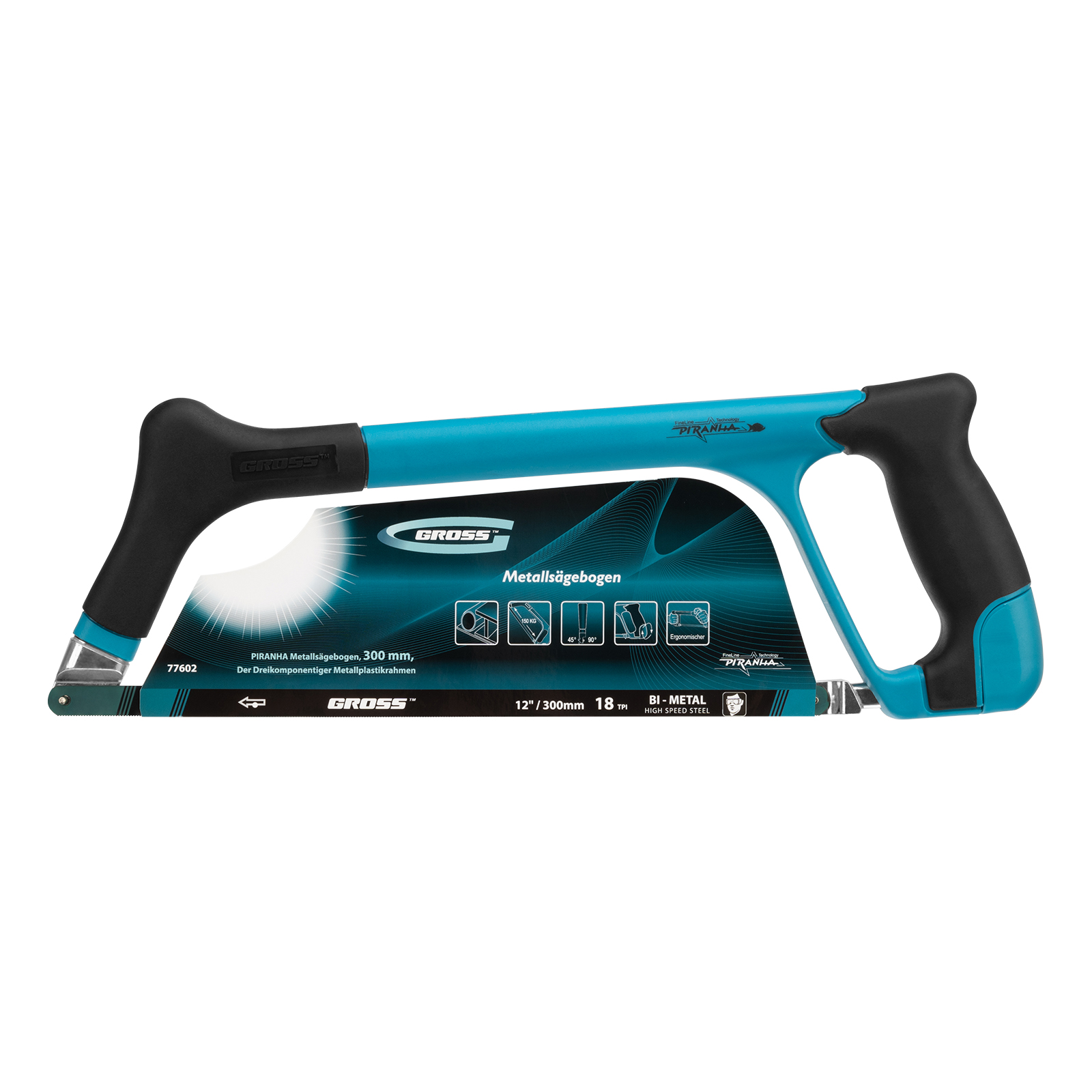 Ножовка по металлу Gross «PIRANHA» 77602, 300 мм, с трехкомпонентной металлопластиковой рамкой, рассчитана на профессиональное использование. Позволяет выполнять не только поперечный, но и продольный рез, т.к. имеется возможность установки полотна под углом 45° и 90°. Благодаря винтовому механизму можно регулировать степень натяжки полотна для повышения точности реза.