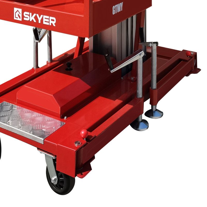 - Безопасность продумана до мелочей: есть скоба для страховочного троса, спиртовой уровень поможет установить подъемник строго вертикально, а выдвижные опоры (аутригеры) гарантируют устойчивость на любой поверхности.