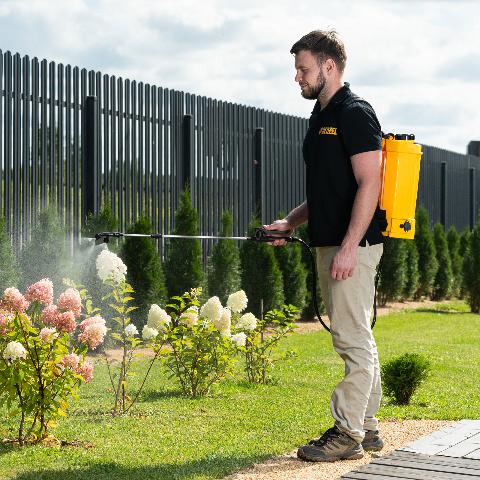 - Максимально комфортное использование — опрыскиватель не зависит от электросети, не требует сложного технического обслуживания и не выделяет неприятного запаха и вредных выхлопов.