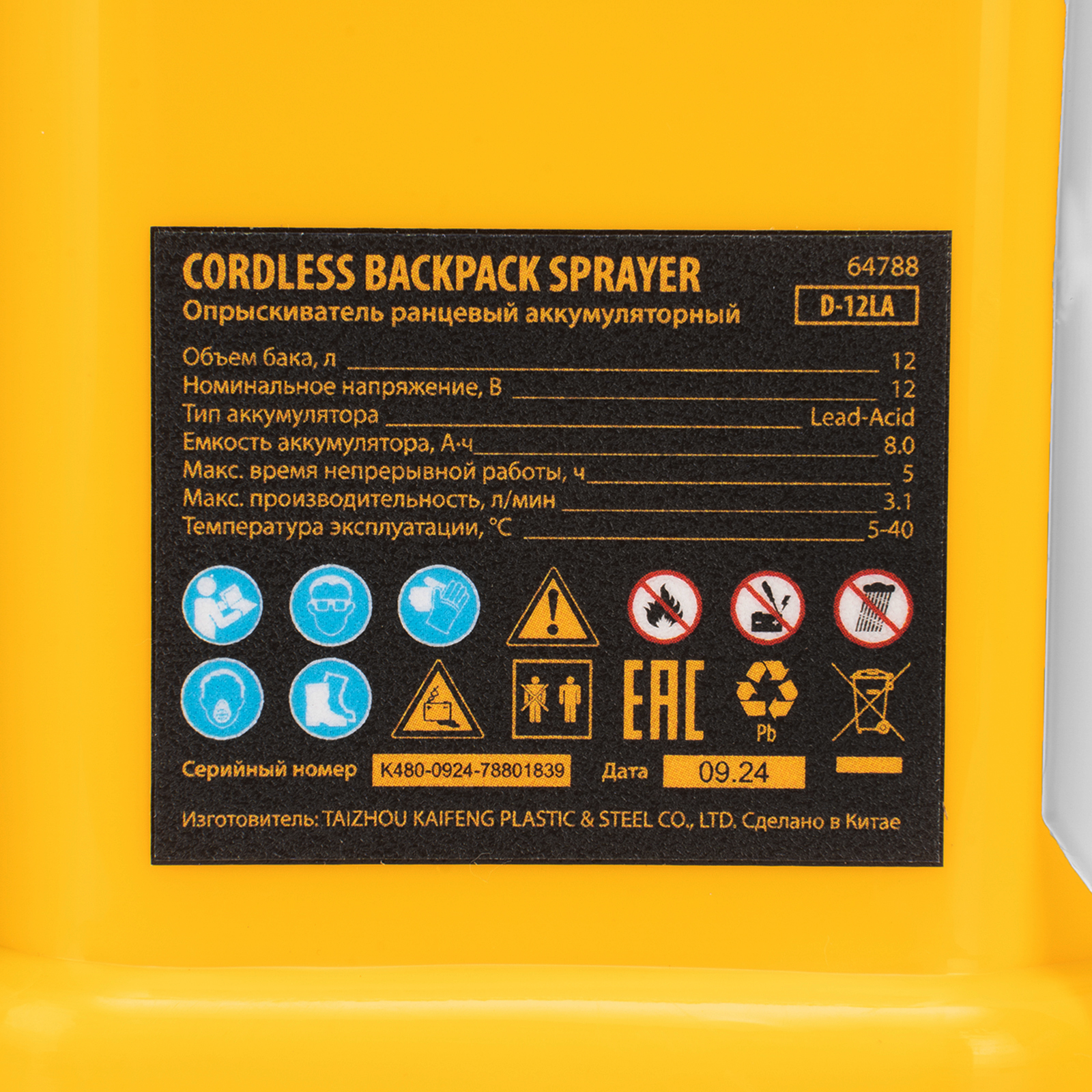 Ранцевый аккумуляторный опрыскиватель Denzel D-12LA 64788 с баком объемом 12 л и батареей на 12 В, емкостью 8 Ач, предназначен для распыления воды или инсектицидов. Используется для ухода за растениями, дезинфекции помещения, мытья окон и фасадов. Длина штанги регулируется в диапазоне 470-820 мм, а максимальная дальность распыления составляет 4 м, что облегчает обработку труднодоступных мест.