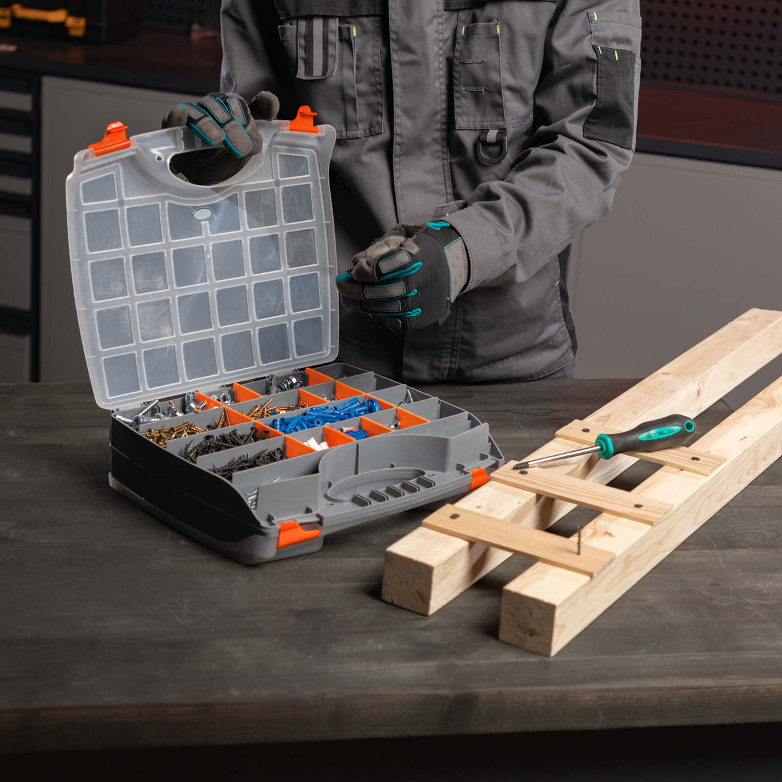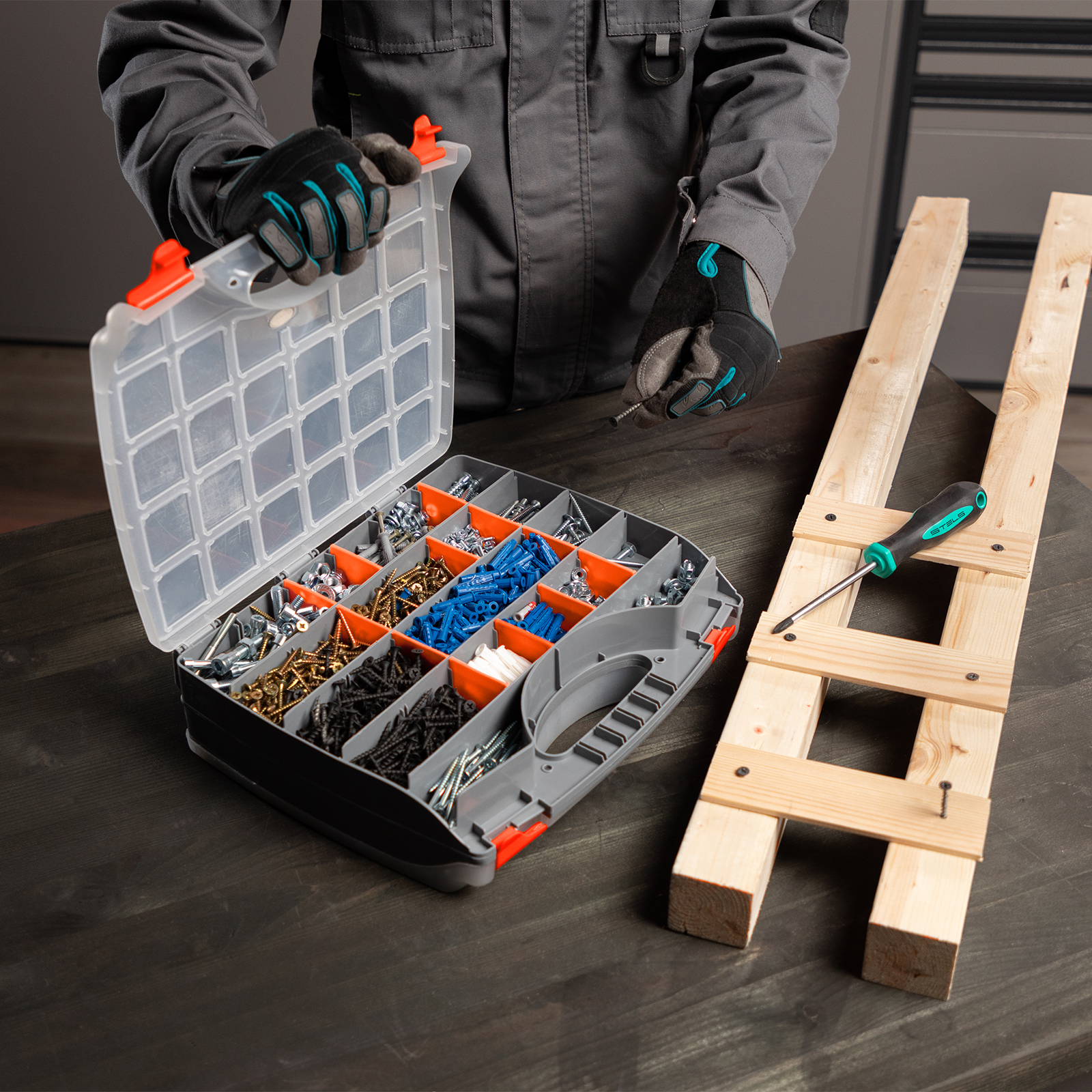 Двухсторонний органайзер из пластика Stels 90709 размером 325 х 280 х 85 мм пригодится в хозяйстве и мастерской для хранения крепежных элементов, принадлежностей для рукоделия, снастей и т.д. Он обеспечивает быстрый доступ к предметам, не допуская их перемешивания и утери.