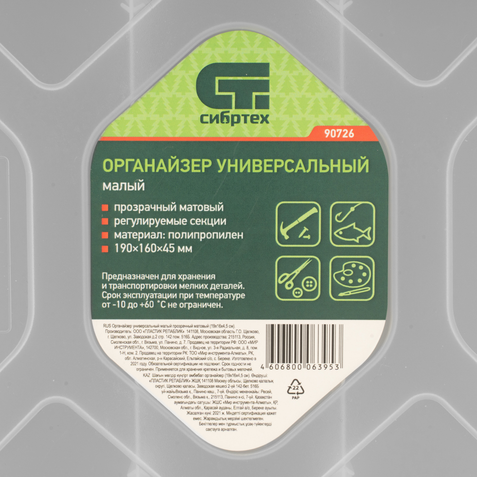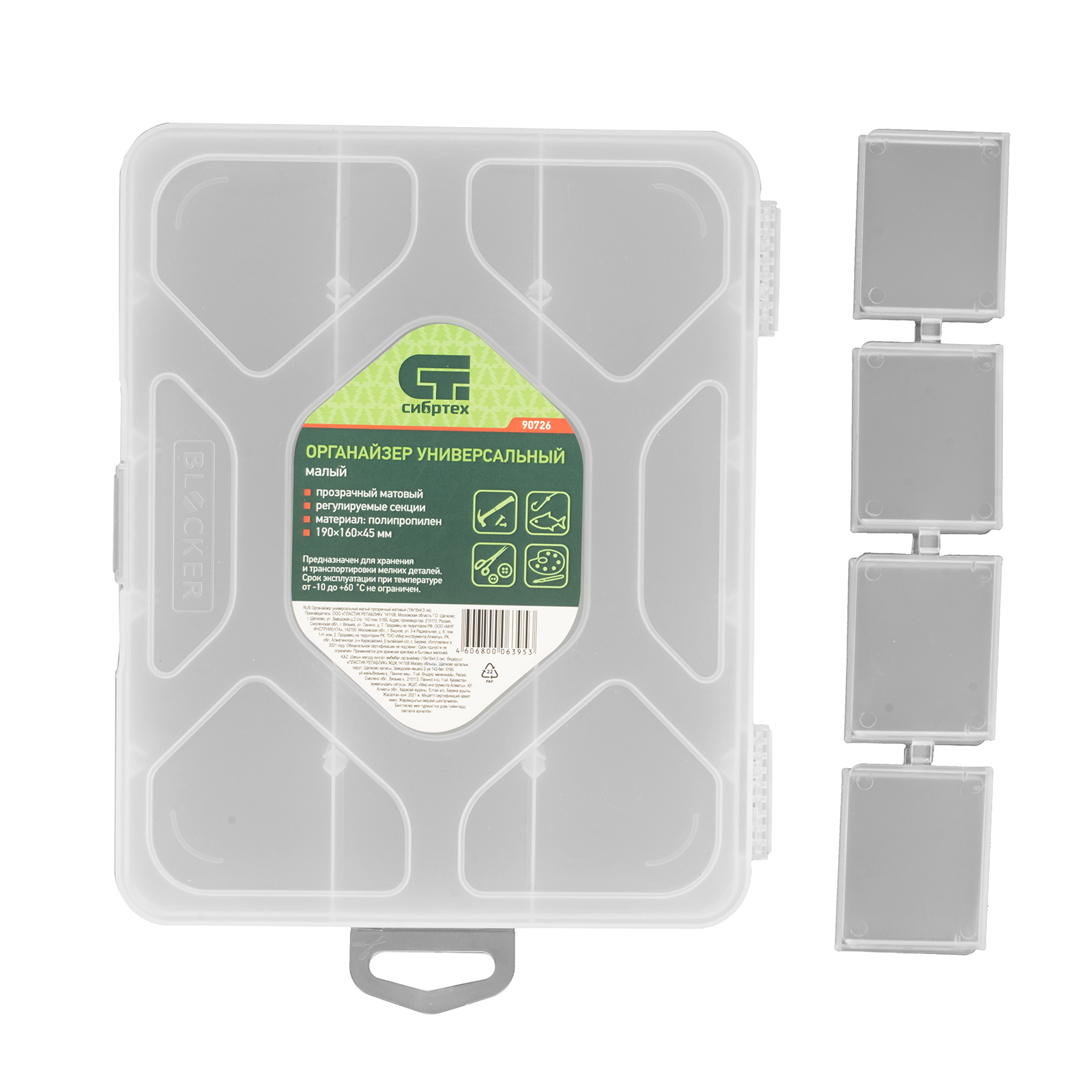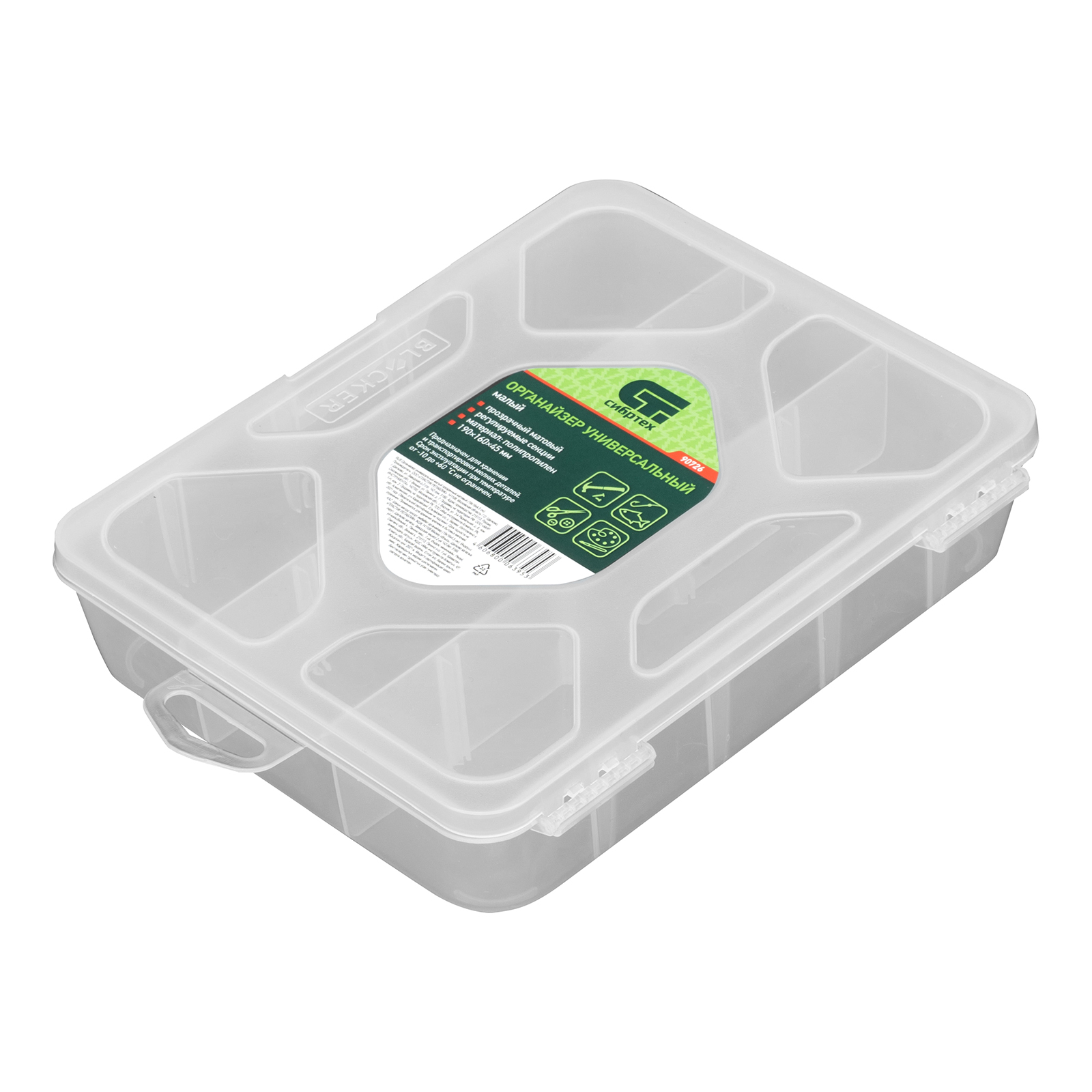 Универсальный малый органайзер Сибртех 90726 размером 190 х 160 х 45 мм, прозрачный матовый, используется для практичного хранения мелких предметов. Он подходит для распределения снастей, крепежа, хозяйственных мелочей и других предметов. Органайзер позволяет компактно расположить вещи в скрытых уголках квартиры: в шкафу, под кроватью и т.д.