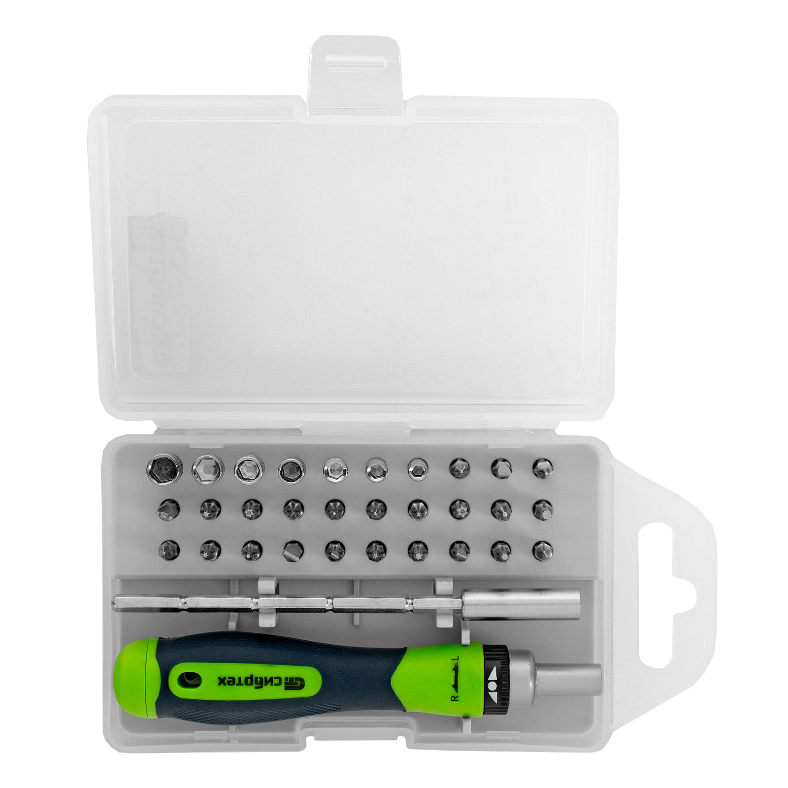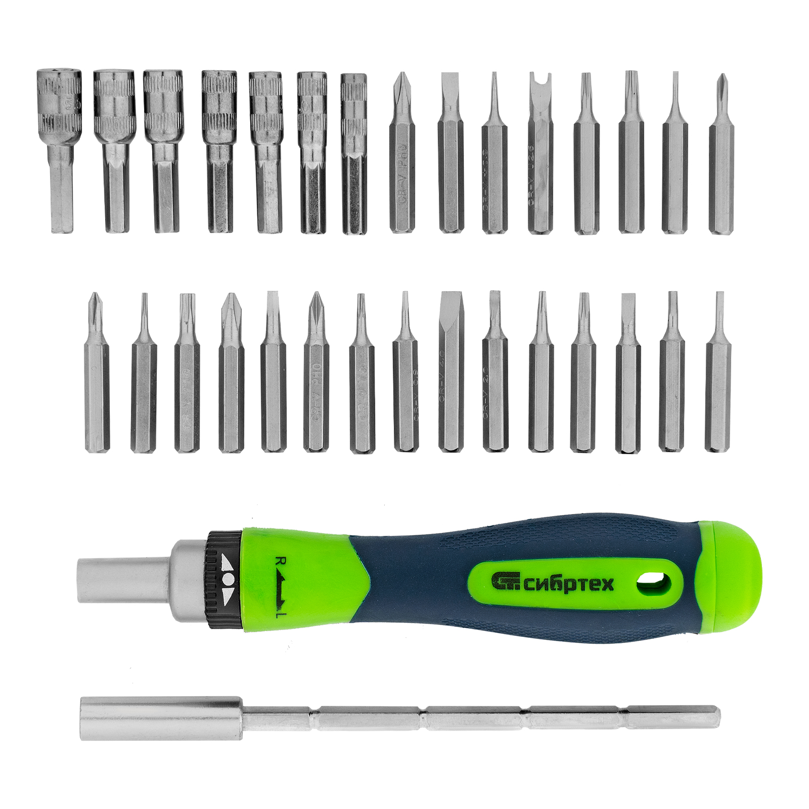 Отвертка реверсивная для точных работ с набором бит и торцевых головок, 32 предмета, CrV Сибртех в Воронеже