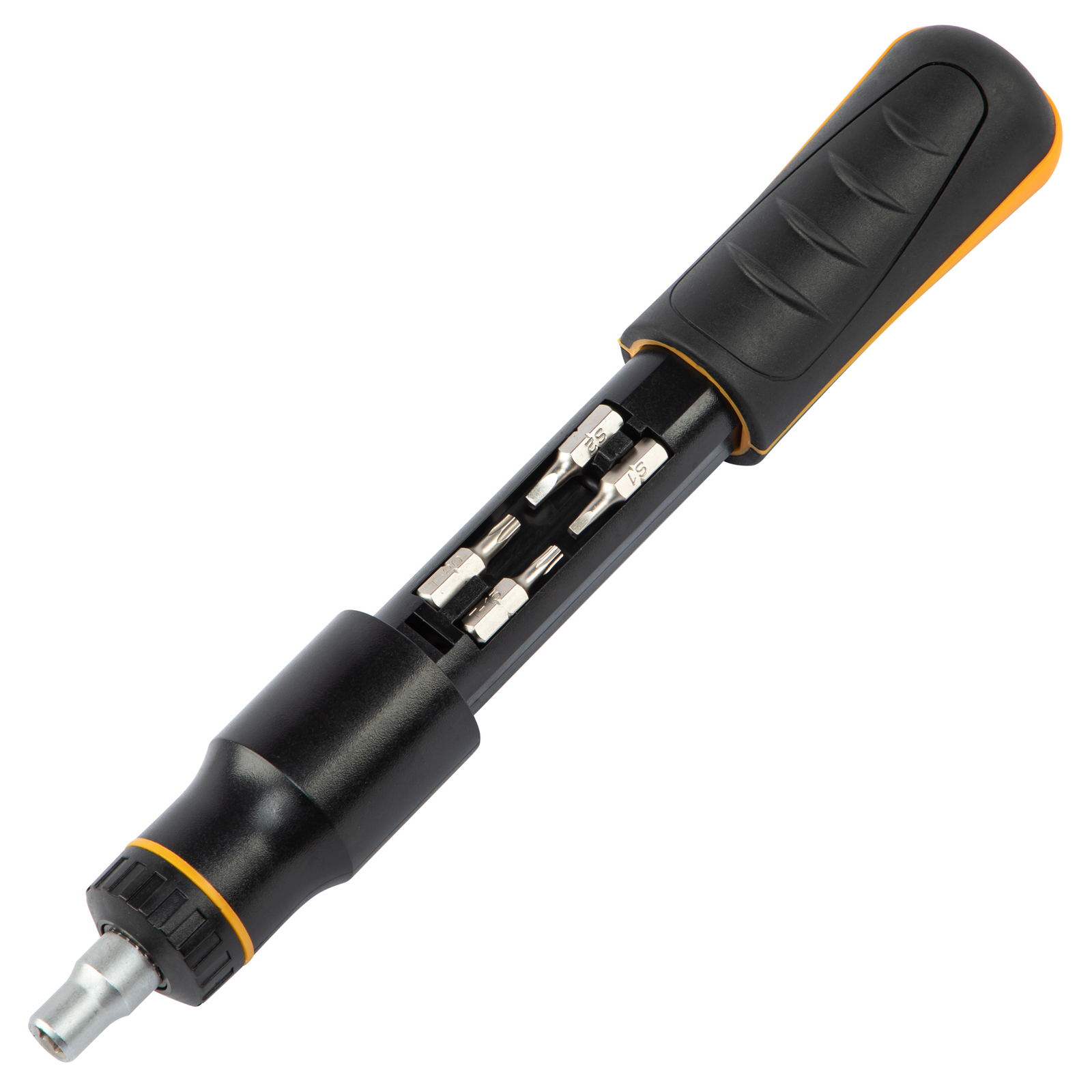 Реверсивная отвертка с револьверным механизмом Denzel 7711601 из стали S2, в наборе из 11 предметов, значительно повышает производительность работы при монтаже/демонтаже крепежа. За счет храпового механизма не нужно перехватывать руку или вынимать шлиц из крепежа, поэтому инструмент оптимален для профессионального использования. В качестве сменных насадок для отвертки можно применять любые биты длиной 25 мм с хвостовиком 1/4 дюйма.