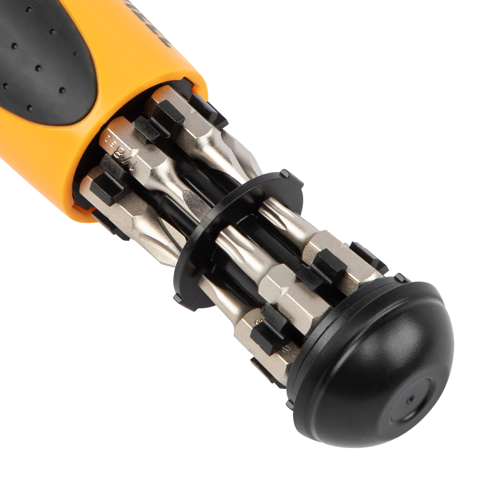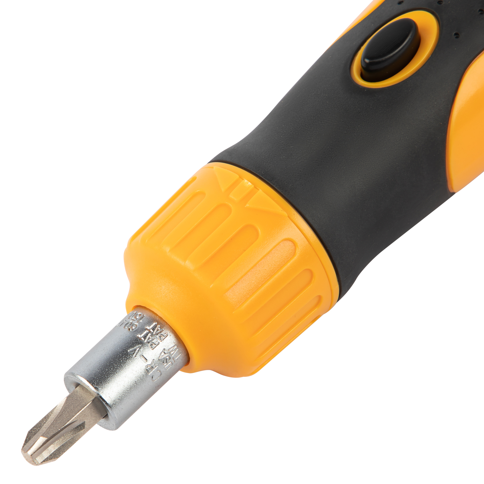 Реверсивная отвертка Denzel 7711611 с механизмом SmartPush комплектуется 12 битами из стали S2 для работы с крепежом типа PH, SL, TORX и SQUARE. Реверсивный механизм избавляет от необходимости перехватывать отвертку, что повышает скорость проведения работ. Отвертка универсальна, т. к. с ней можно использовать любые биты длиной 25 мм с хвостовиком 1/4". Она будет полезна не только частным мастерам, но и профессионалам.