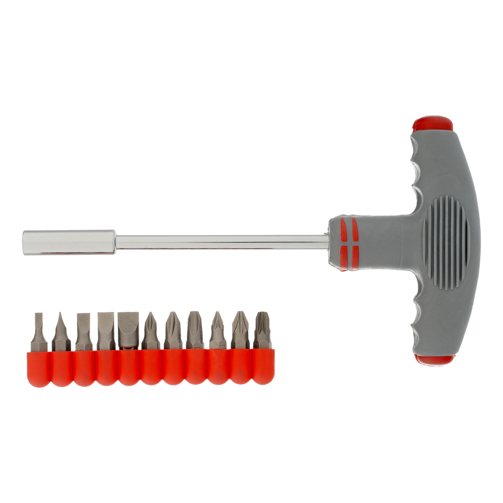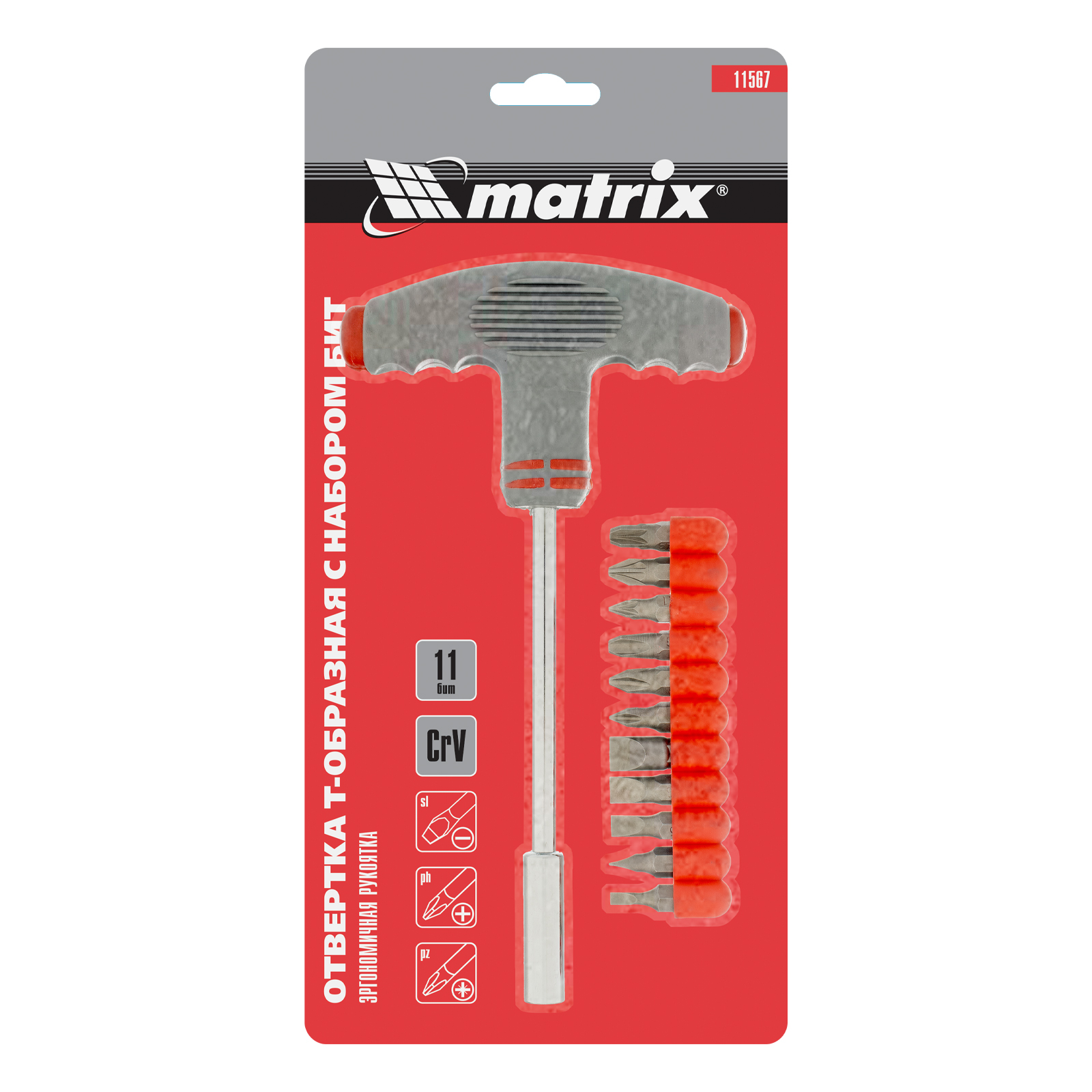 Отвертка с Т-образной эргономичной ручкой и набором бит, 11 шт, CrV Matrix в Воронеже