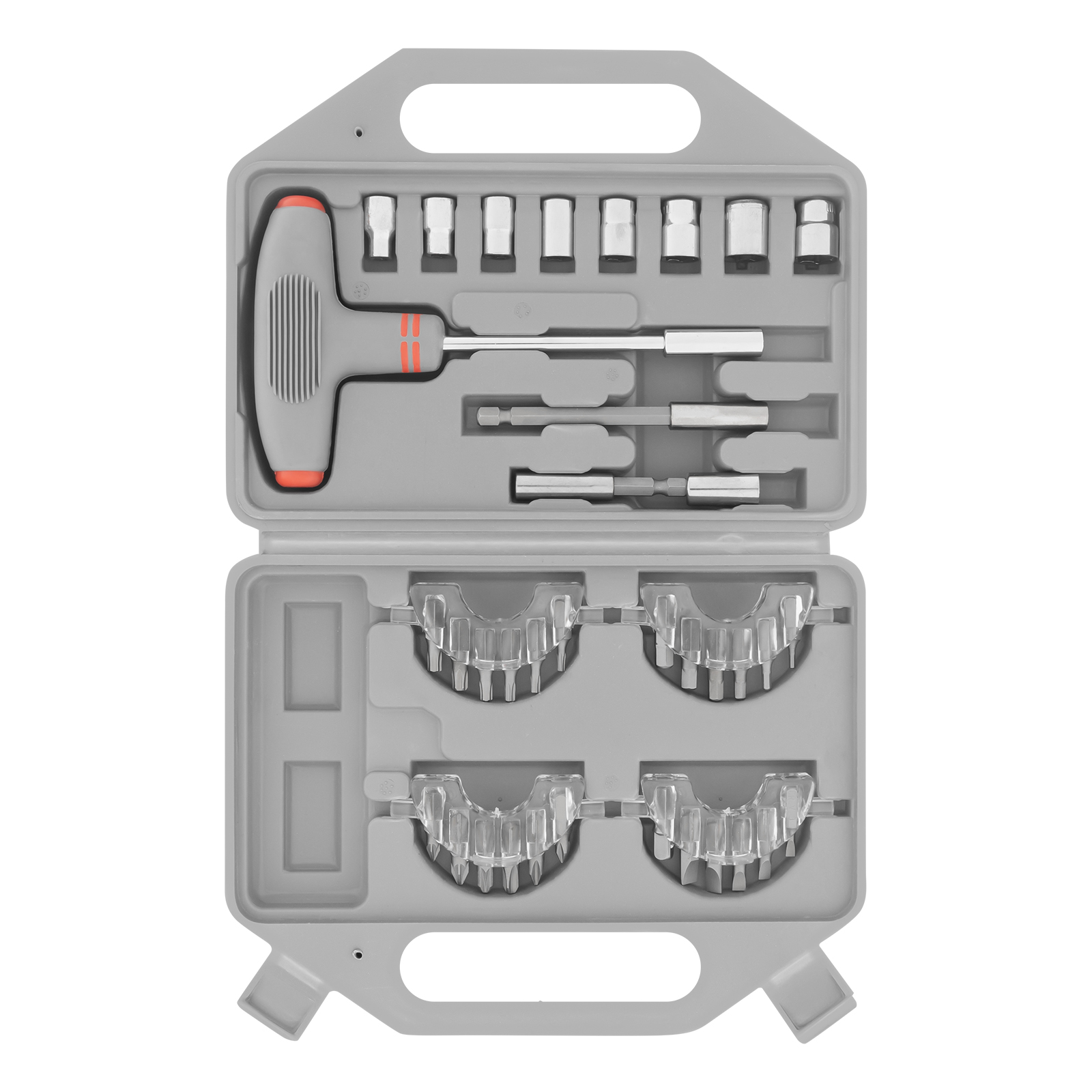 - Биты помещены в держатели и сгруппированы в соответствии с типами шлицев, что облегчает подбор нужной насадки.