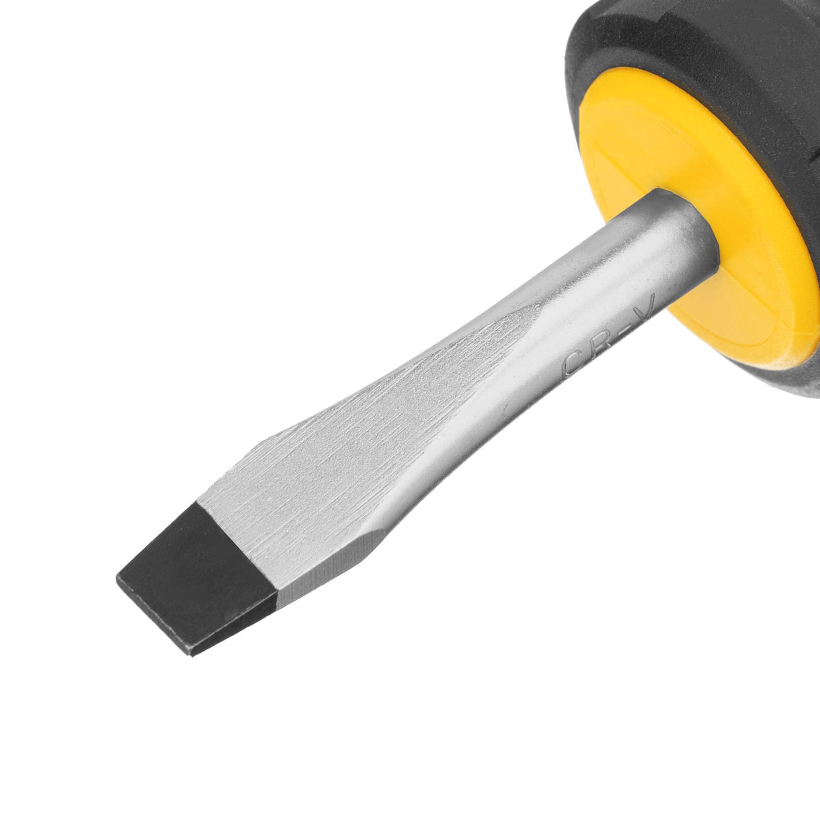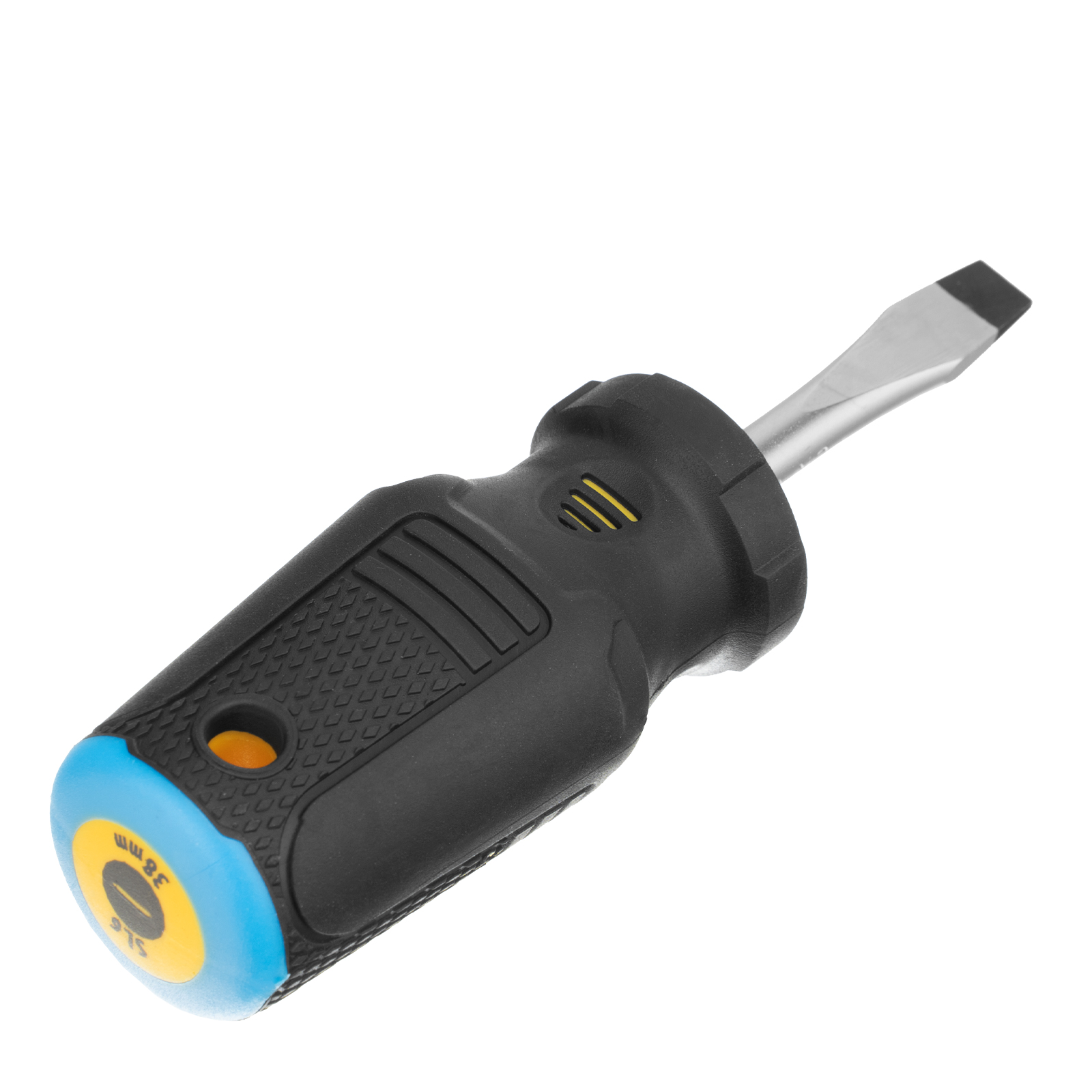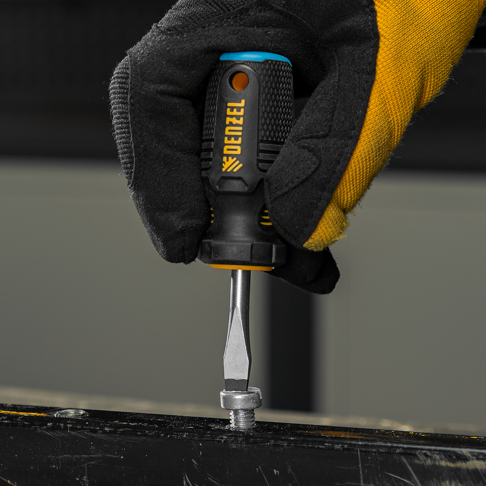 Отвертка SL6 х 38 мм Denzel 12201 из стали CrV, с трехкомпонентной рукояткой, используется для монтажа и демонтажа винтов и саморезов с прямым шлицем Slotted. Намагниченный шлиц крепко фиксируется в головке крепежа. Отвертка выдерживает интенсивное применение и предназначена для выполнения профессиональных ремонтных и монтажных работ.