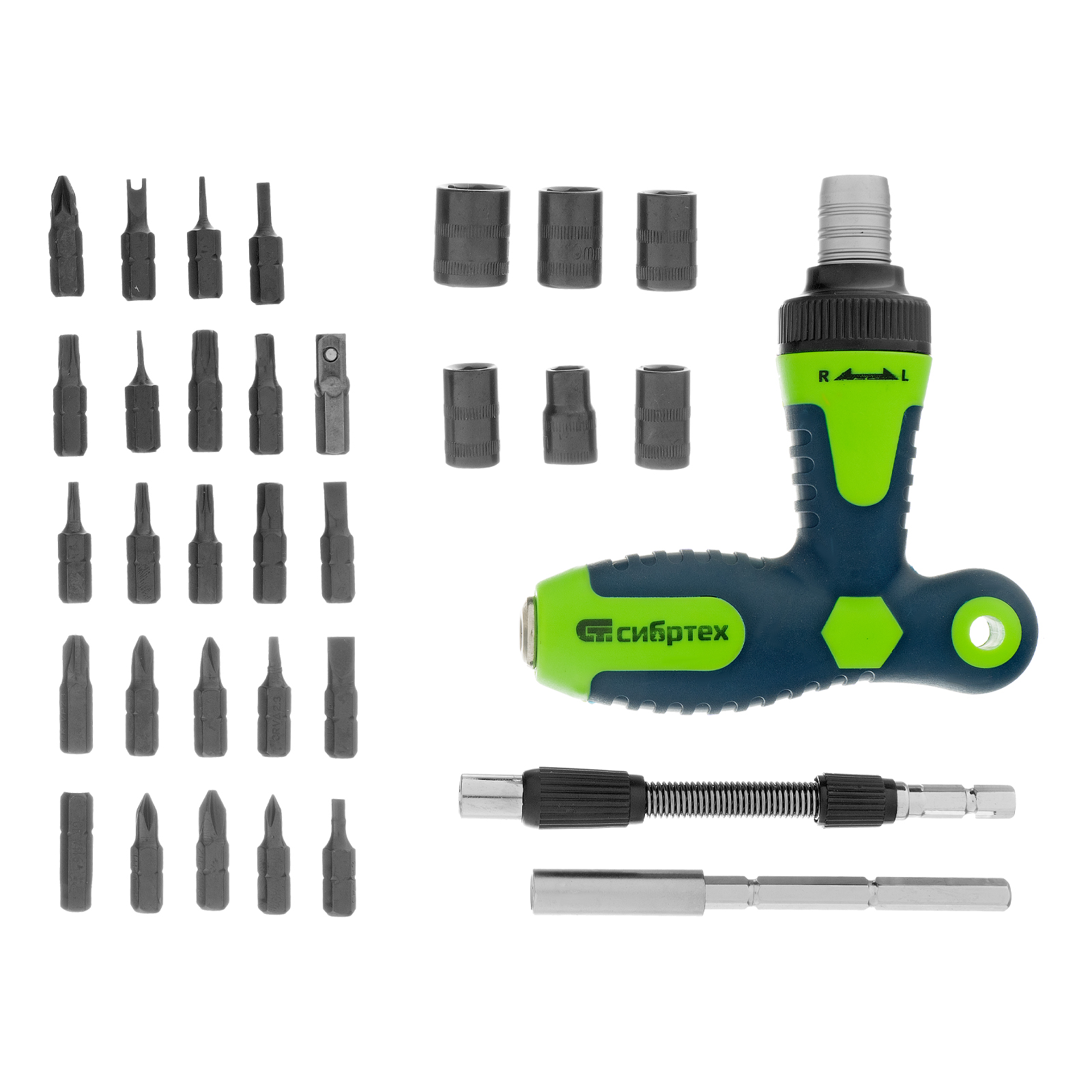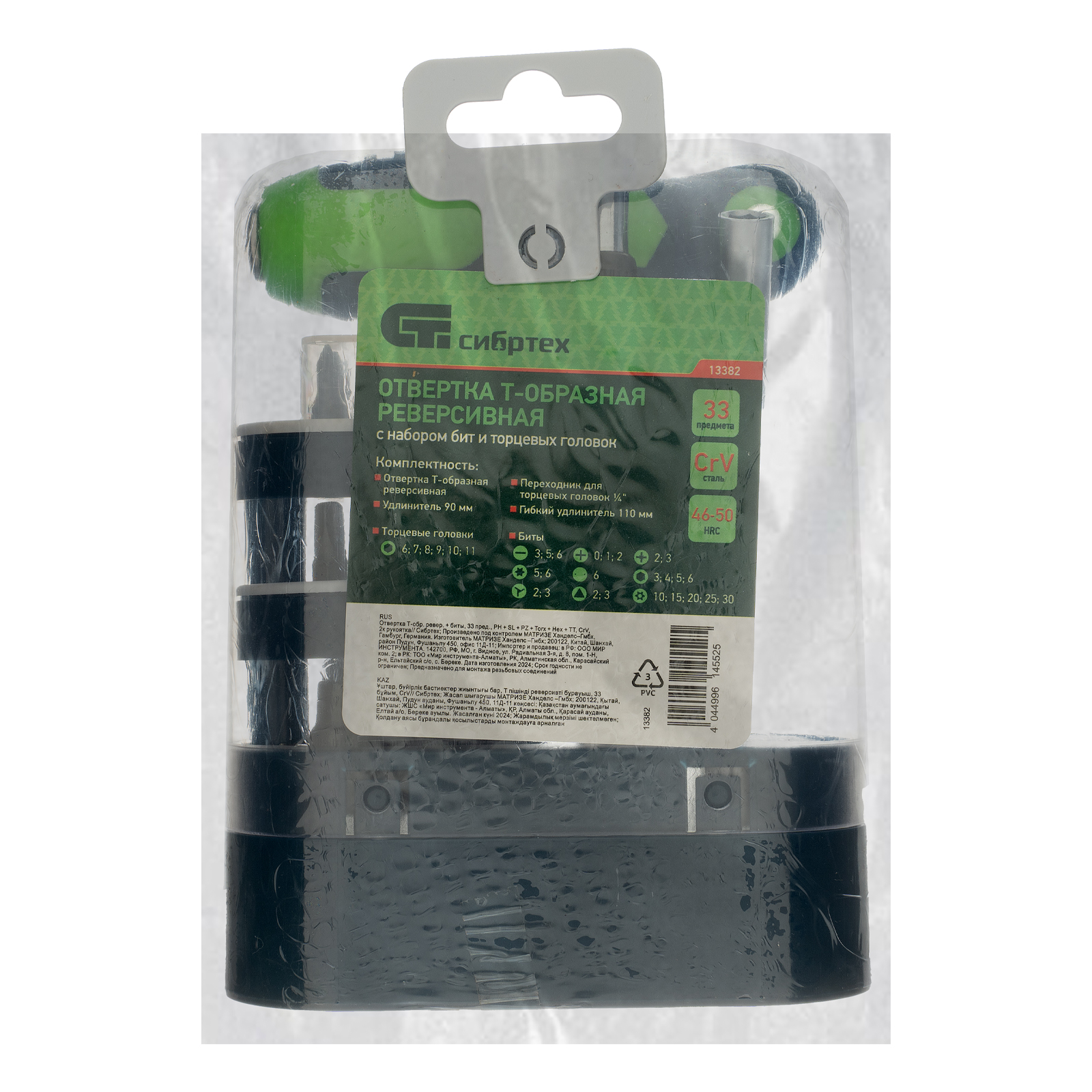 Отвертка Т-образная реверсивная с набором бит, торцевых головок, 33 предмета, CrV Сибртех в Воронеже